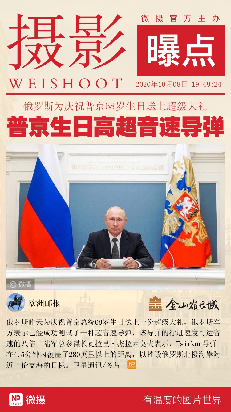 俄罗斯昨天为庆祝普京总统68岁生日送上一份超级大礼,俄罗斯军方表示已经成功测试了一种超音速导弹,该导弹的行进速度可达音速的八倍。陆军总参谋长瓦拉里·杰拉西莫夫表示,Tsirkon导弹在4.5分钟内覆盖了280英里以上的距离,以摧毁俄罗斯北极海岸附近巴伦支海的目标。卫星通讯/图片