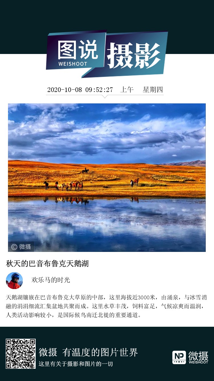 天鹅湖镶嵌在巴音布鲁克大草原的中部,这里海拔近3000米,由涌泉,与冰雪消融的涓涓细流汇集盆地共聚而成。这里水草丰茂,饲料富足,气候凉爽而温润,人类活动影响较小,是国际候鸟南迁北徙的重要通道。