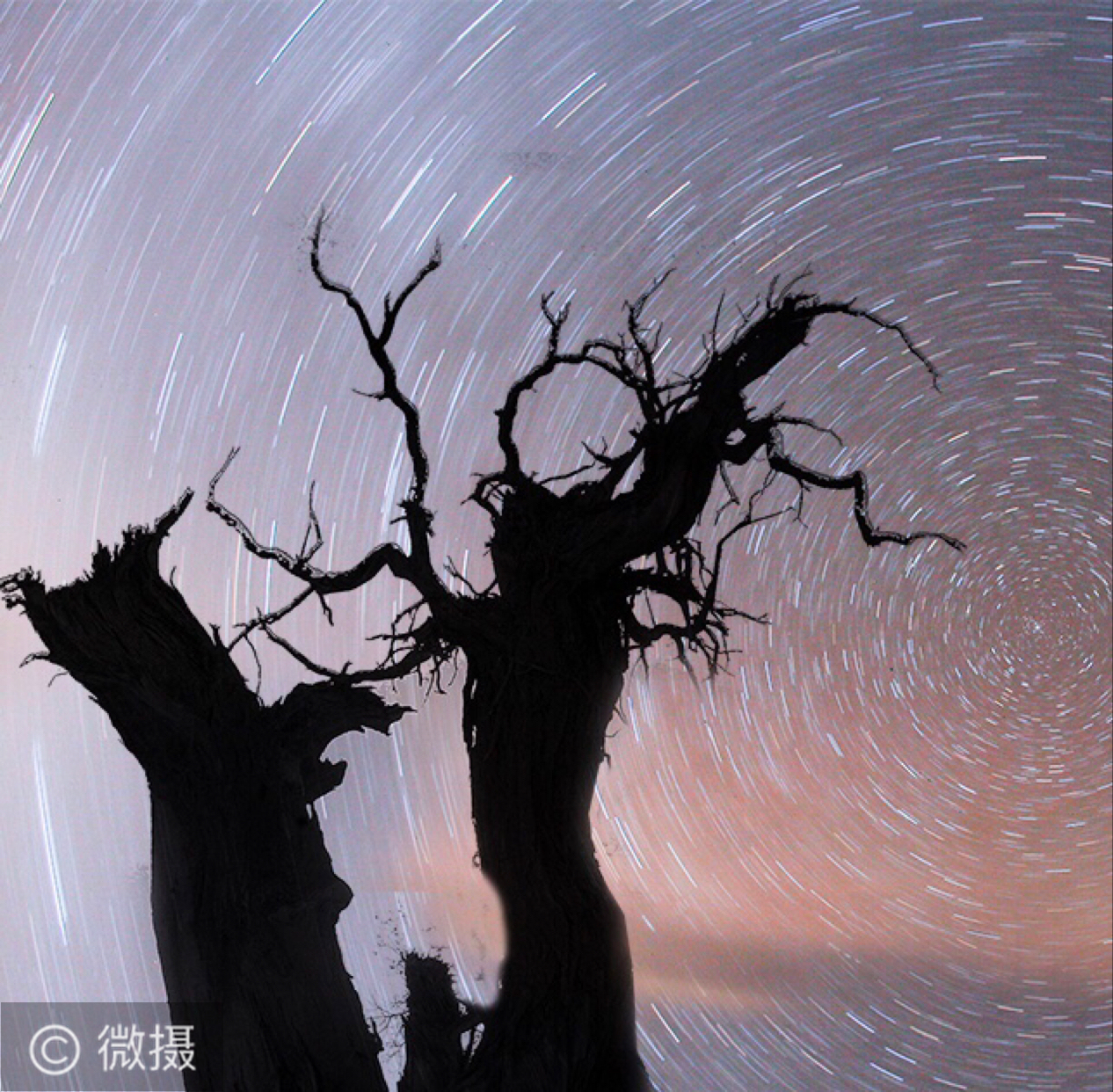 《坚毅》胡杨有强大的生命力,在传统的颂歌中,胡杨诠释的是一种精神——坚毅,“活着千年不死,死后千年不倒,倒了千年不朽”。星轨背景更能体现胡杨枝干的刚强,并能显示悠远的时光。