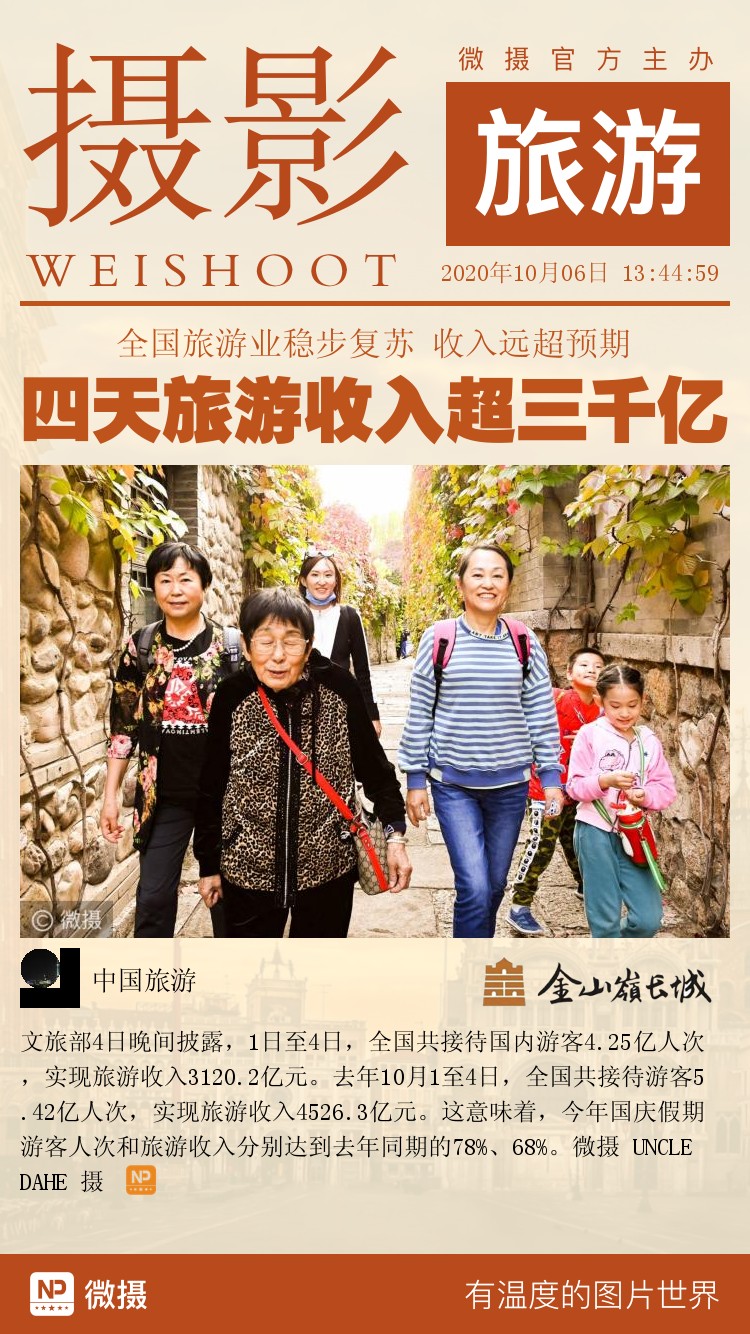 文旅部4日晚间披露,1日至4日,全国共接待国内游客4.25亿人次,实现旅游收入3120.2亿元。去年10月1至4日,全国共接待游客5.42亿人次,实现旅游收入4526.3亿元。这意味着,今年国庆假期游客人次和旅游收入分别达到去年同期的78%、68%。微摄 UNCLE DAHE 摄