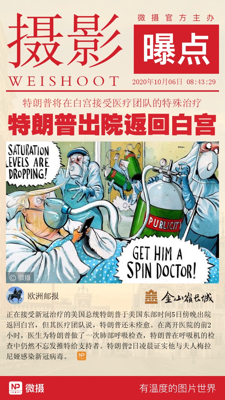 正在接受新冠治疗的美国总统特朗普于美国东部时间5日傍晚出院返回白宫,但其医疗团队说,特朗普还未痊愈。在离开医院的前2小时,医生为特朗普做了一次肺部呼吸检查,特朗普在呼吸机的检查中仍然不忘发推特给支持者。特朗普2日凌晨证实他与夫人梅拉尼娅感染新冠病毒。