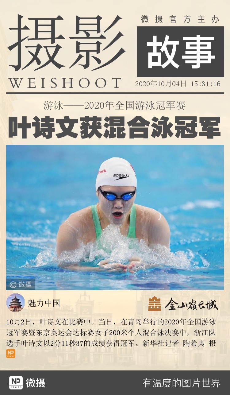 10月2日,叶诗文在比赛中。当日,在青岛举行的2020年全国游泳冠军赛暨东京奥运会达标赛女子200米个人混合泳决赛中,浙江队选手叶诗文以2分11秒37的成绩获得冠军。新华社记者 陶希夷 摄
