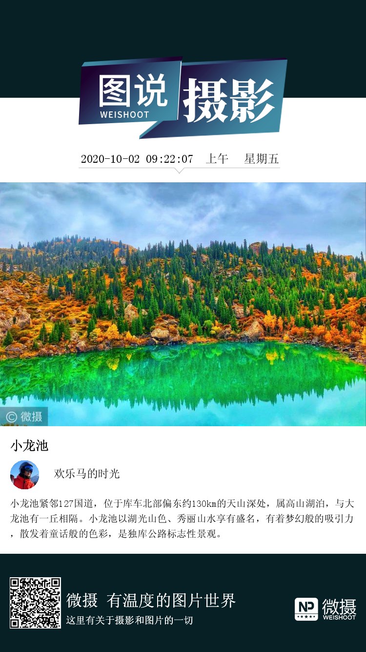 小龙池紧邻127国道,位于库车北部偏东约130km的天山深处,属高山湖泊,与大龙池有一丘相隔。小龙池以湖光山色、秀丽山水享有盛名,有着梦幻般的吸引力,散发着童话般的色彩,是独库公路标志性景观。