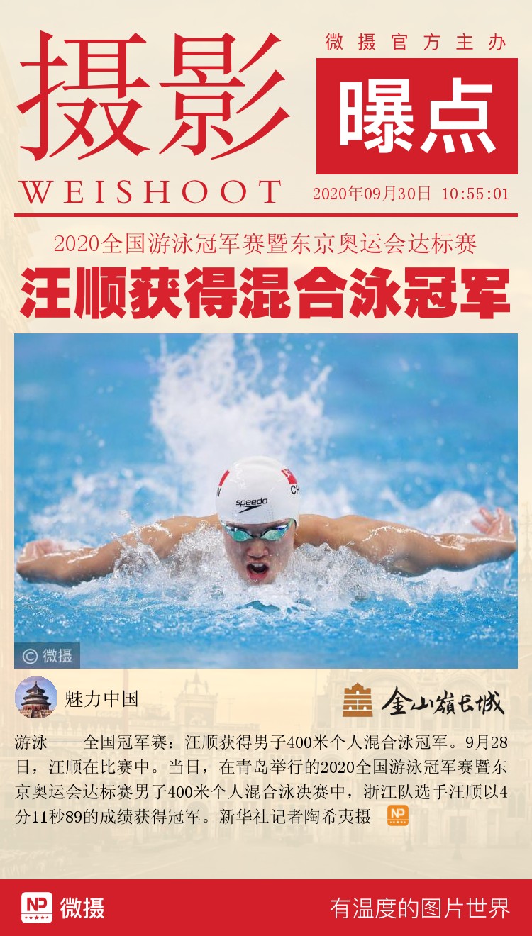 游泳——全国冠军赛:汪顺获得男子400米个人混合泳冠军。9月28日,汪顺在比赛中。当日,在青岛举行的2020全国游泳冠军赛暨东京奥运会达标赛男子400米个人混合泳决赛中,浙江队选手汪顺以4分11秒89的成绩获得冠军。新华社记者陶希夷摄