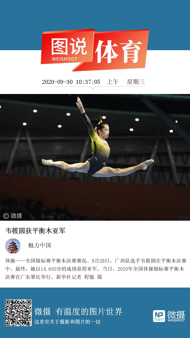 体操——全国锦标赛平衡木决赛赛况。9月28日,广西队选手韦筱圆在平衡木决赛中。最终,她以14.600分的成绩获得亚军。当日,2020年全国体操锦标赛平衡木决赛在广东肇庆举行。新华社记者 程敏 摄