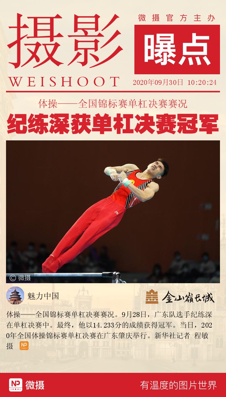 体操——全国锦标赛单杠决赛赛况。9月28日,广东队选手纪练深在单杠决赛中。最终,他以14.233分的成绩获得冠军。当日,2020年全国体操锦标赛单杠决赛在广东肇庆举行。新华社记者 程敏 摄