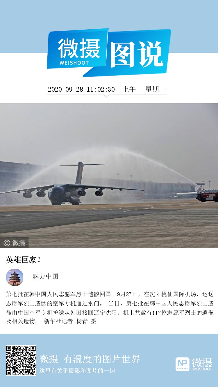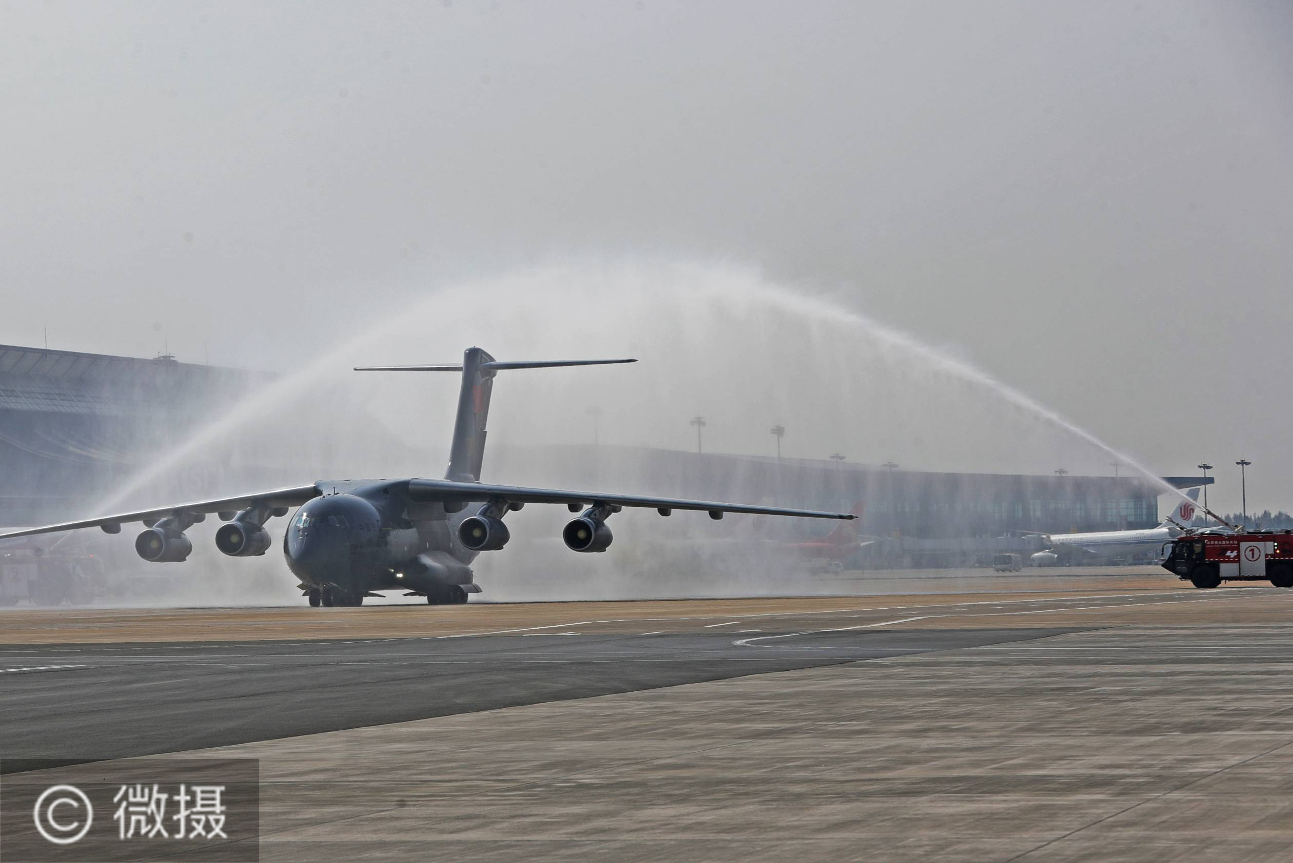 第七批在韩中国人民志愿军烈士遗骸回国。9月27日,在沈阳桃仙国际机场,运送志愿军烈士遗骸的空军专机通过水门。 当日,第七批在韩中国人民志愿军烈士遗骸由中国空军专机护送从韩国接回辽宁沈阳。机上共载有117位志愿军烈士的遗骸及相关遗物。 新华社记者 杨青 摄