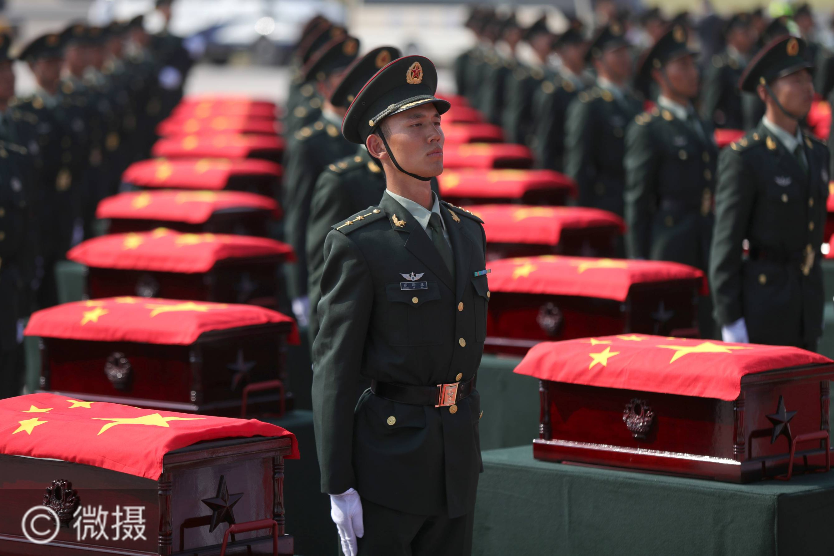 第七批在韩中国人民志愿军烈士遗骸回国。9月27日,在沈阳桃仙国际机场,礼兵将殓放志愿军烈士遗骸的棺椁从专机上护送至棺椁摆放区。 当日,第七批在韩中国人民志愿军烈士遗骸由中国空军专机护送从韩国接回辽宁沈阳。机上共载有117位志愿军烈士的遗骸及相关遗物。 新华社记者杨青摄
