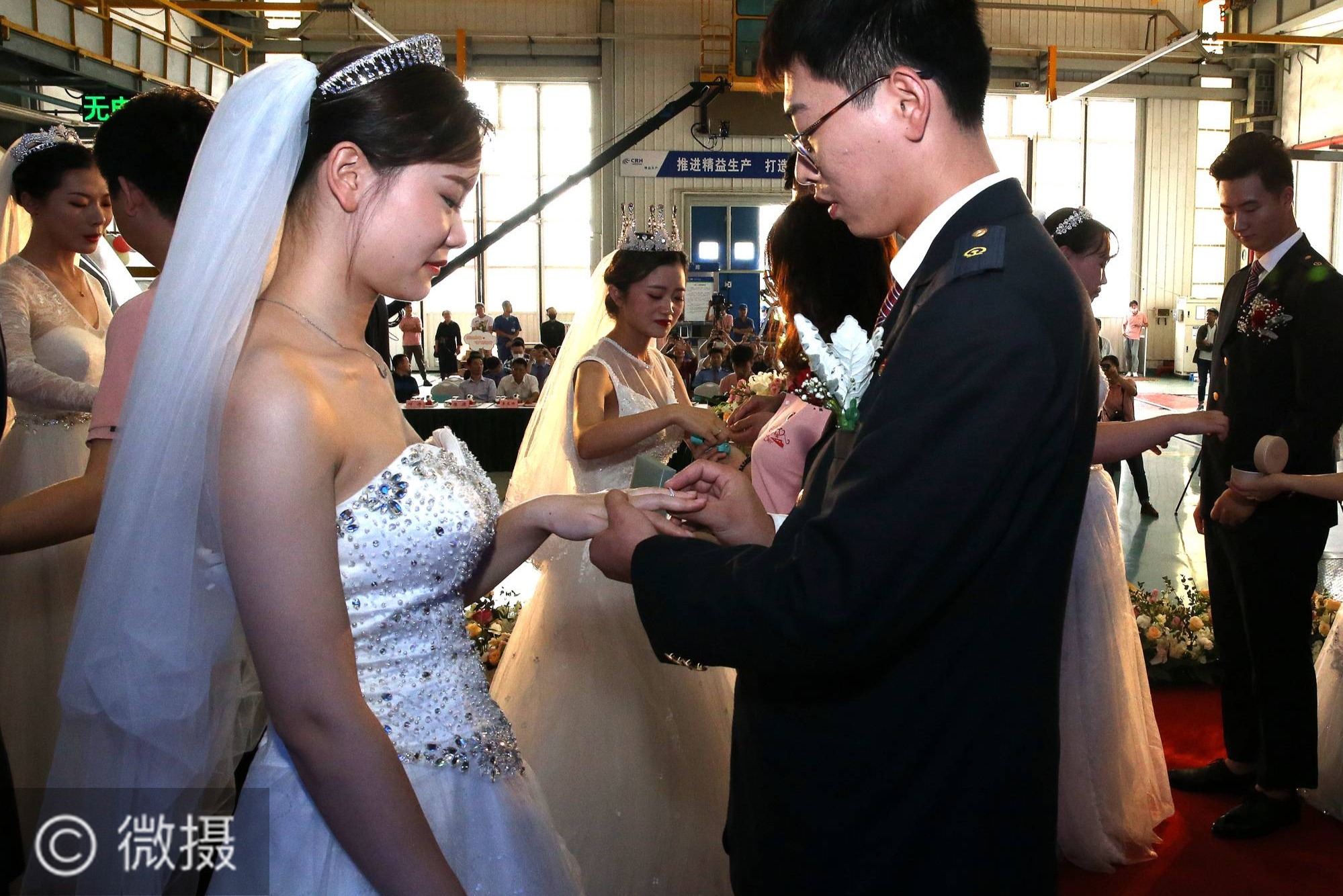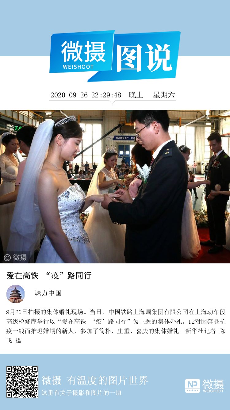 9月26日拍摄的集体婚礼现场。当日,中国铁路上海局集团有限公司在上海动车段高级检修库举行以“爱在高铁 ‘疫’路同行”为主题的集体婚礼。12对因奔赴抗疫一线而推迟婚期的新人,参加了简朴、庄重、喜庆的集体婚礼。新华社记者 陈飞 摄