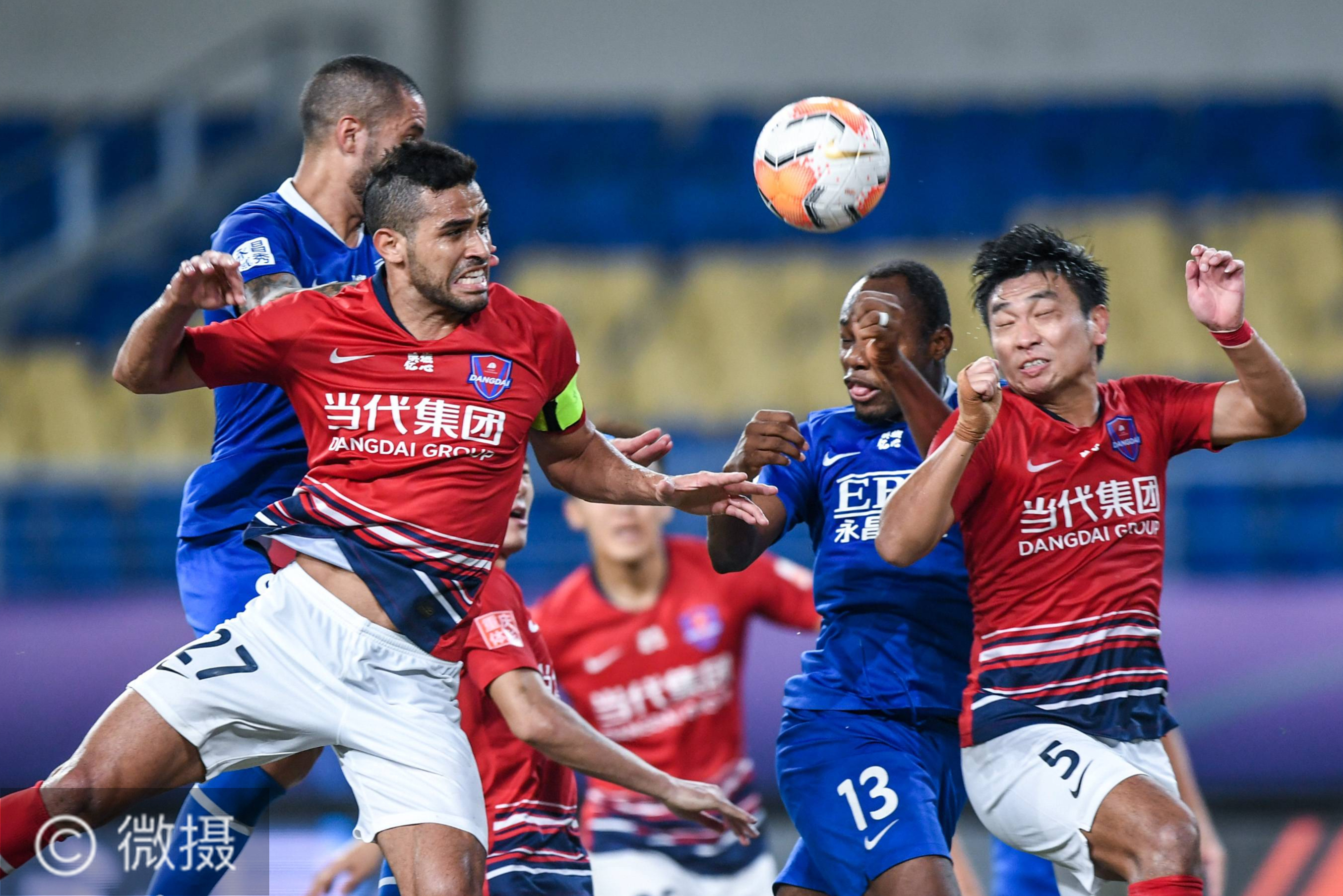 2020中超联赛第一阶段第13轮全部比赛于9月24日、25日两天结束争夺。24日,山东鲁能以2:0战胜河南建业,苏宁则在一场肉搏战中2:1战胜广州恒大,两支胜队均锁定第二阶段争冠组席位。9月25日,重庆当代队球员卡尔德克、蒋哲和石家庄永昌队球员苏祖在比赛中拼抢。新华社记者李博摄