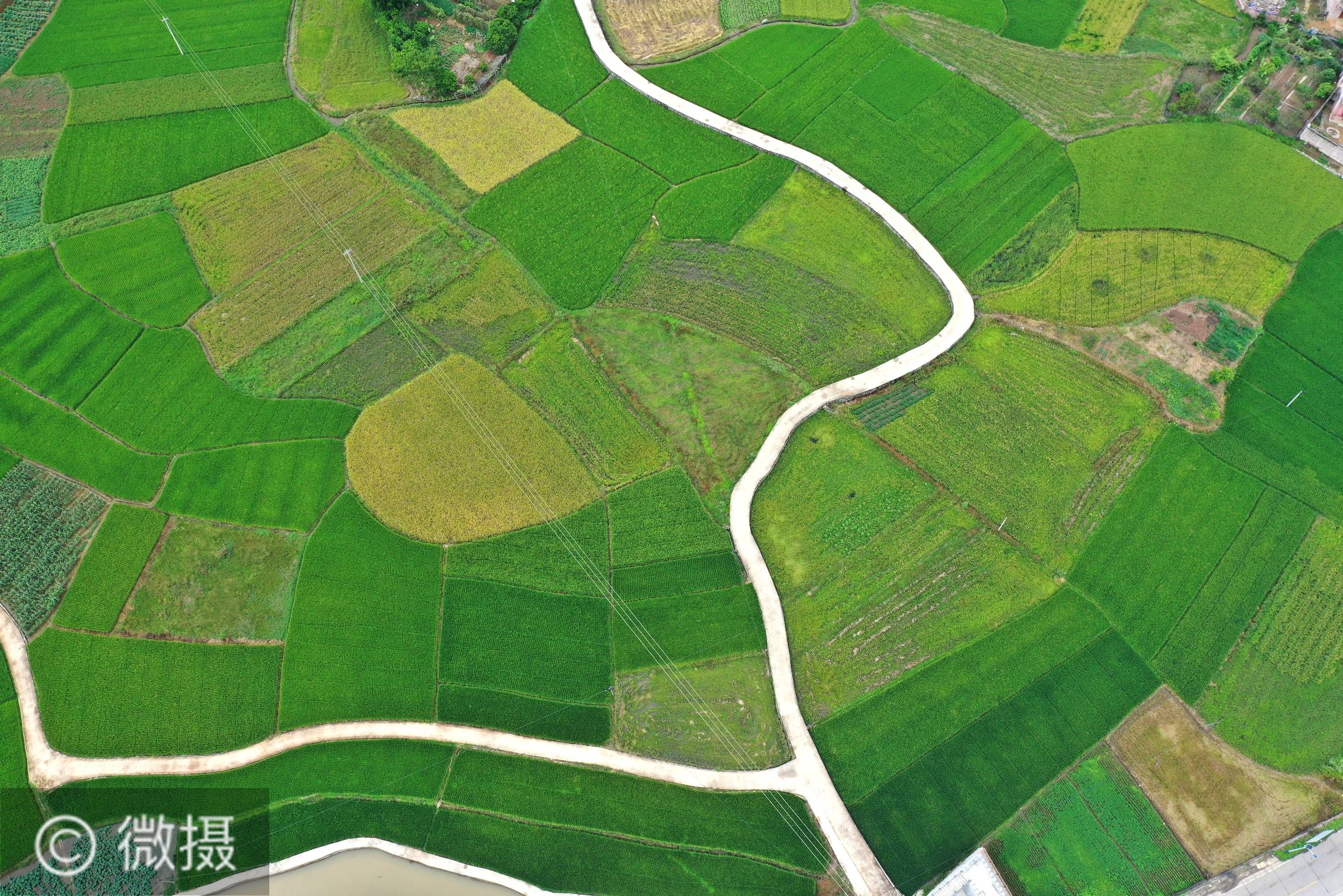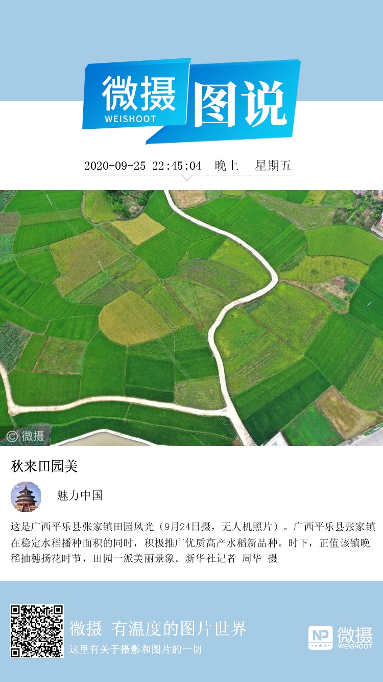 这是广西平乐县张家镇田园风光(9月24日摄,无人机照片)。广西平乐县张家镇在稳定水稻播种面积的同时,积极推广优质高产水稻新品种。时下,正值该镇晚稻抽穗扬花时节,田园一派美丽景象。新华社记者 周华 摄