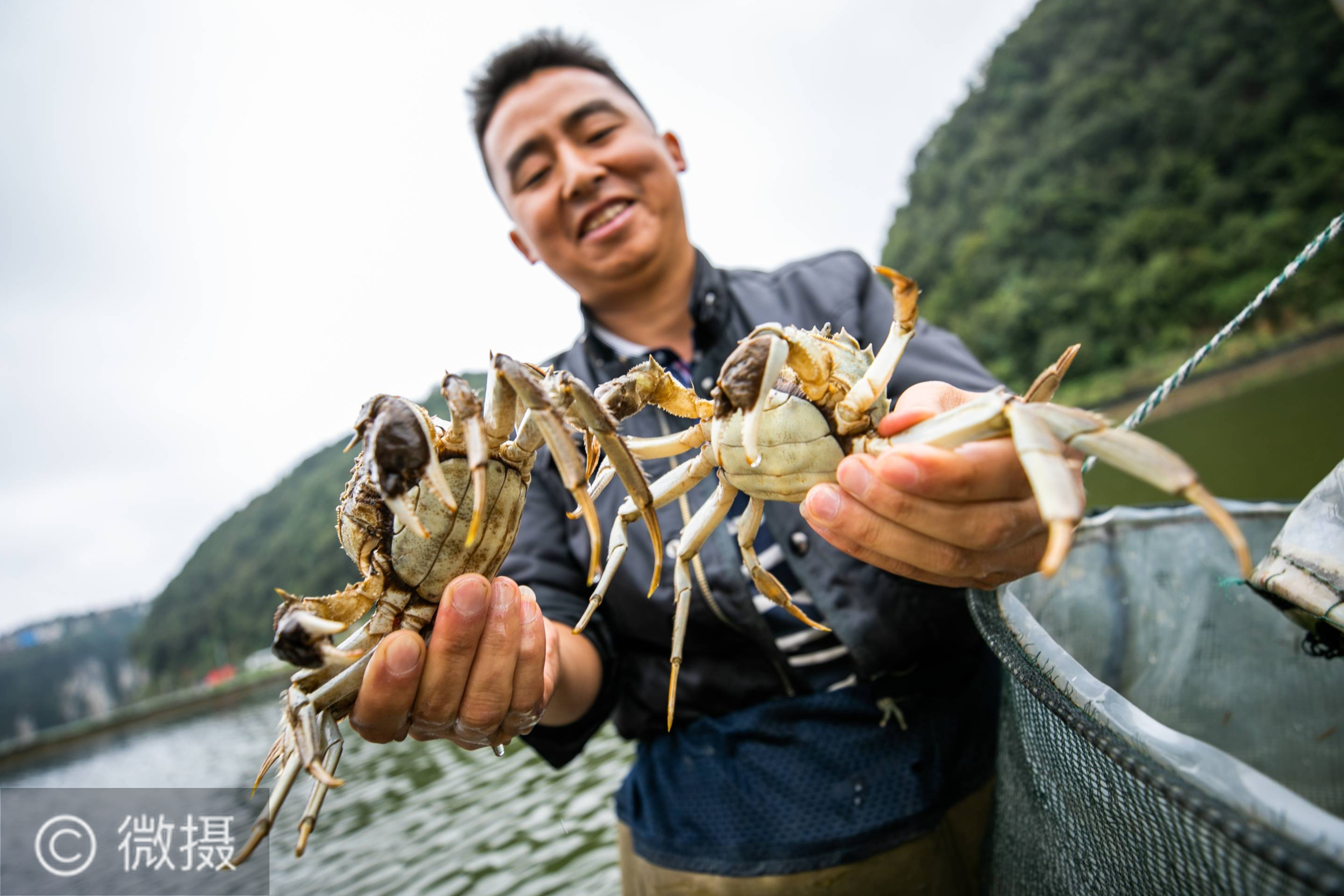 9月24日,陆章朋在贵州省毕节市七星关区清水铺镇后山社区大闸蟹养殖基地展示捕捞的大闸蟹。39岁的陆章朋是贵州省毕节市七星关区清水铺镇后山社区村民,今年,陆章朋的养殖基地规模已经扩大到了近400亩,同时带动200余户村民增收。新华社发(罗大富 摄)