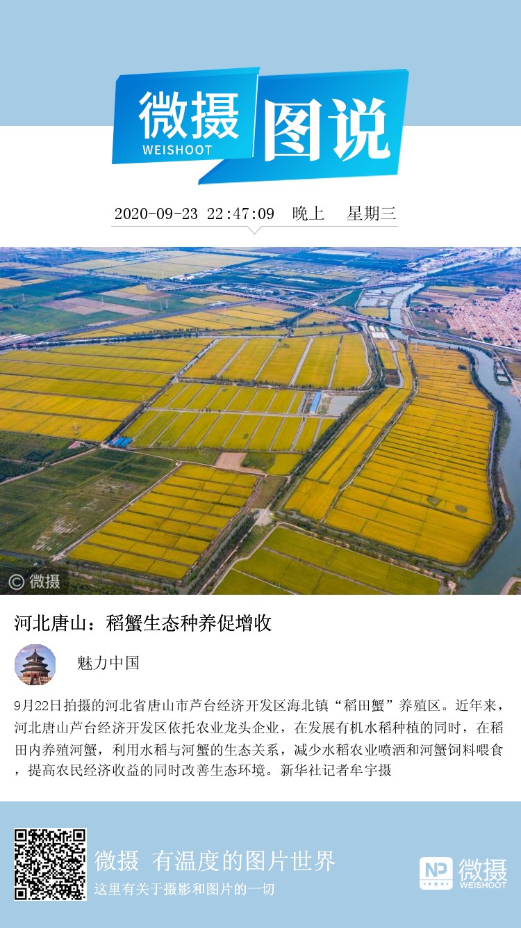 9月22日拍摄的河北省唐山市芦台经济开发区海北镇“稻田蟹”养殖区。近年来,河北唐山芦台经济开发区依托农业龙头企业,在发展有机水稻种植的同时,在稻田内养殖河蟹,利用水稻与河蟹的生态关系,减少水稻农业喷洒和河蟹饲料喂食,提高农民经济收益的同时改善生态环境。新华社记者牟宇摄