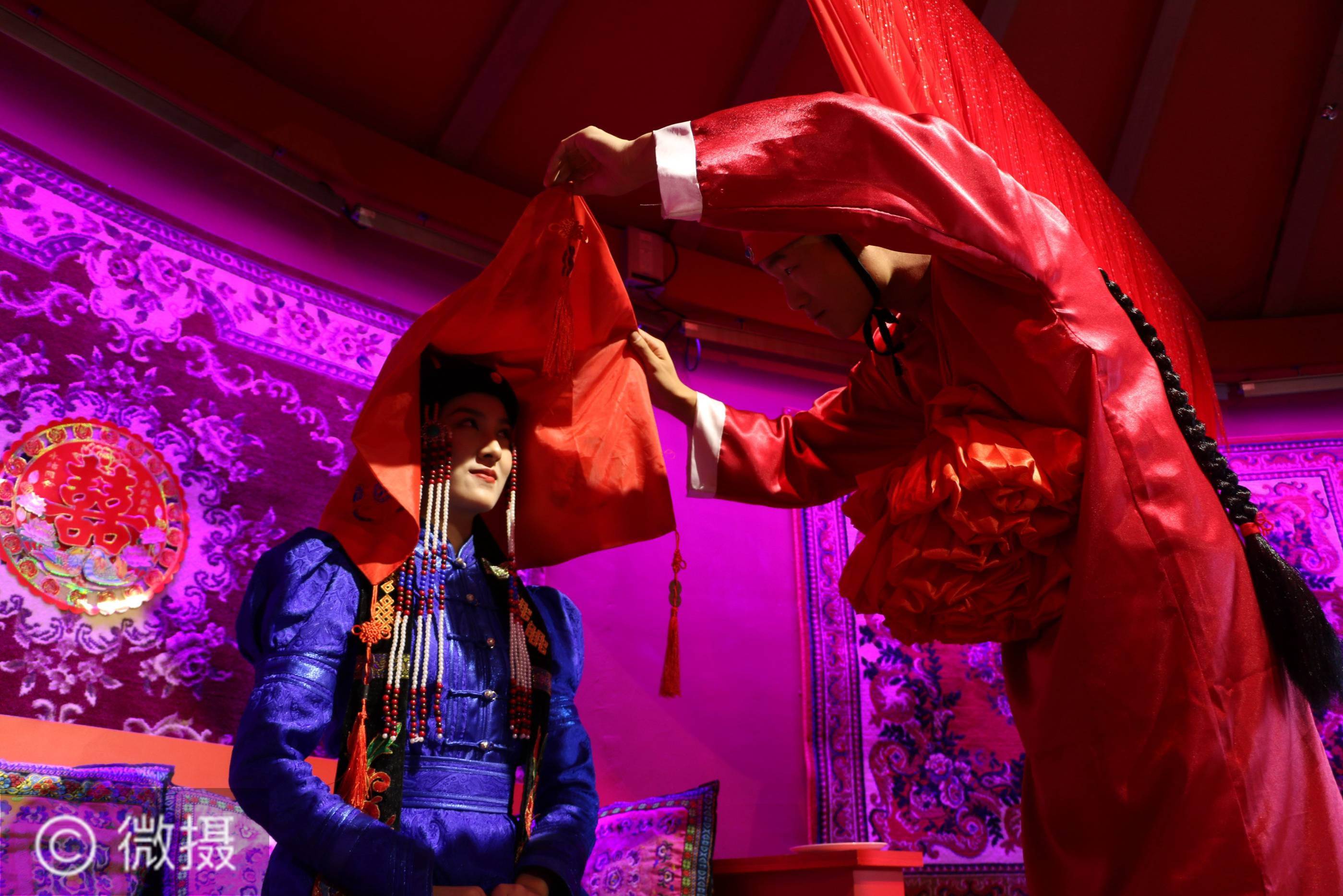 9月22日,在避暑山庄万树园蒙古包景区,演员在排练结婚仪式。近期,河北承德避暑山庄推出沉浸式体验剧《梦入避暑山庄》,迎接国庆长假的到来。据了解,该剧以沉浸式实景为观众再现当年避暑山庄发生的历史事件和民族风情,表演融合了舞蹈、武术等多种表演形式。新华社发(刘环宇摄)