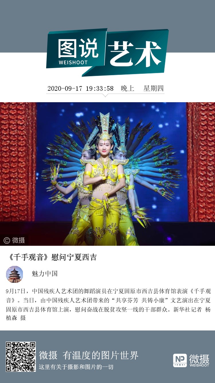 9月17日,中国残疾人艺术团的舞蹈演员在宁夏固原市西吉县体育馆表演《千手观音》。当日,由中国残疾人艺术团带来的“共享芬芳 共铸小康”文艺演出在宁夏固原市西吉县体育馆上演,慰问奋战在脱贫攻坚一线的干部群众。新华社记者 杨植森 摄