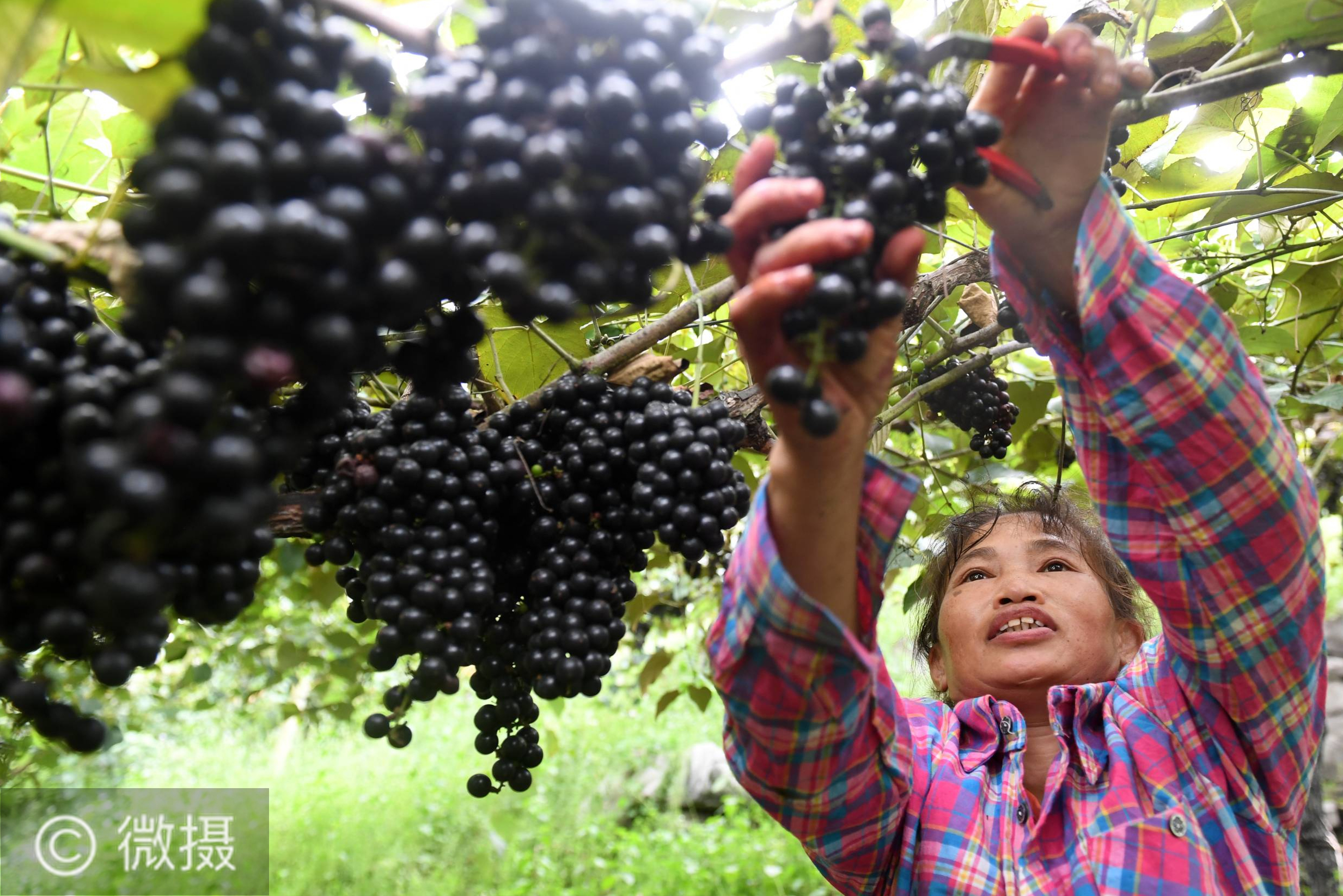 9月16日,在广西罗城仫佬族自治县东门镇大境村,一名村民在采摘毛葡萄。近年来,罗城仫佬族自治县利用毛葡萄生长特性,把发展毛葡萄种植与治理石漠化、脱贫攻坚结合,按“公司+基地+千家万户”的模式大力发展毛葡萄产业。毛葡萄已成为当地群众脱贫致富的重要产业。新华社记者陆波岸摄
