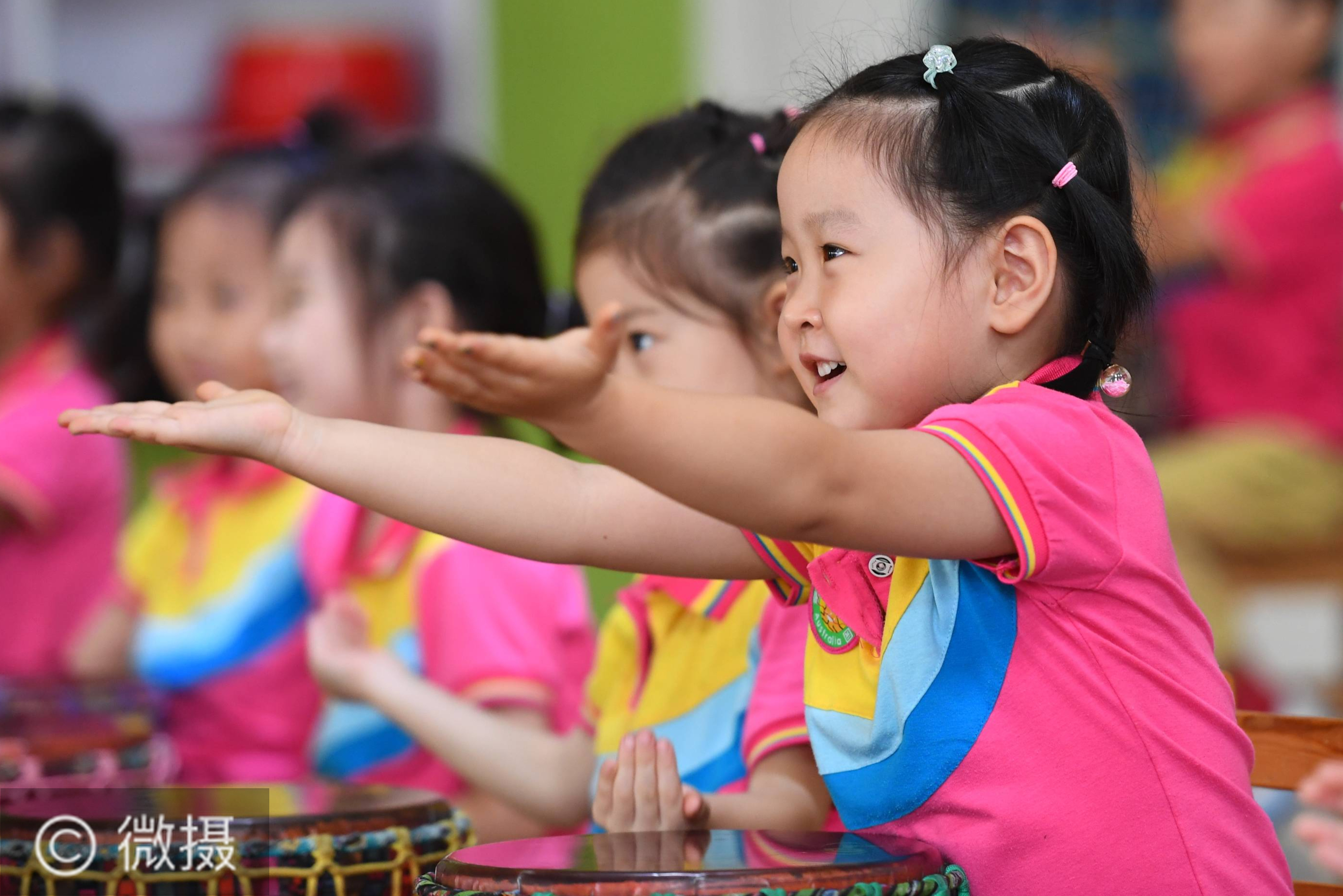 幼儿园小班的小朋友在音乐课上学习手鼓(9月16日摄)。新学期开学以来,山东济南童贝尔幼儿园从儿童视角出发,创新课程设置,寓教于乐,营造宽松和谐的环境,促进孩子们健康成长。新华社记者 朱峥 摄