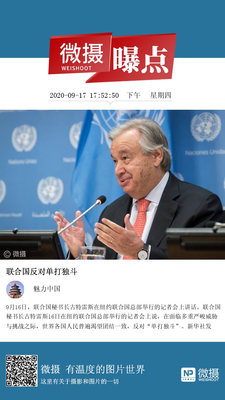 9月16日,联合国秘书长古特雷斯在纽约联合国总部举行的记者会上讲话。联合国秘书长古特雷斯16日在纽约联合国总部举行的记者会上说,在面临多重严峻威胁与挑战之际,世界各国人民普遍渴望团结一致,反对“单打独斗”。新华社发