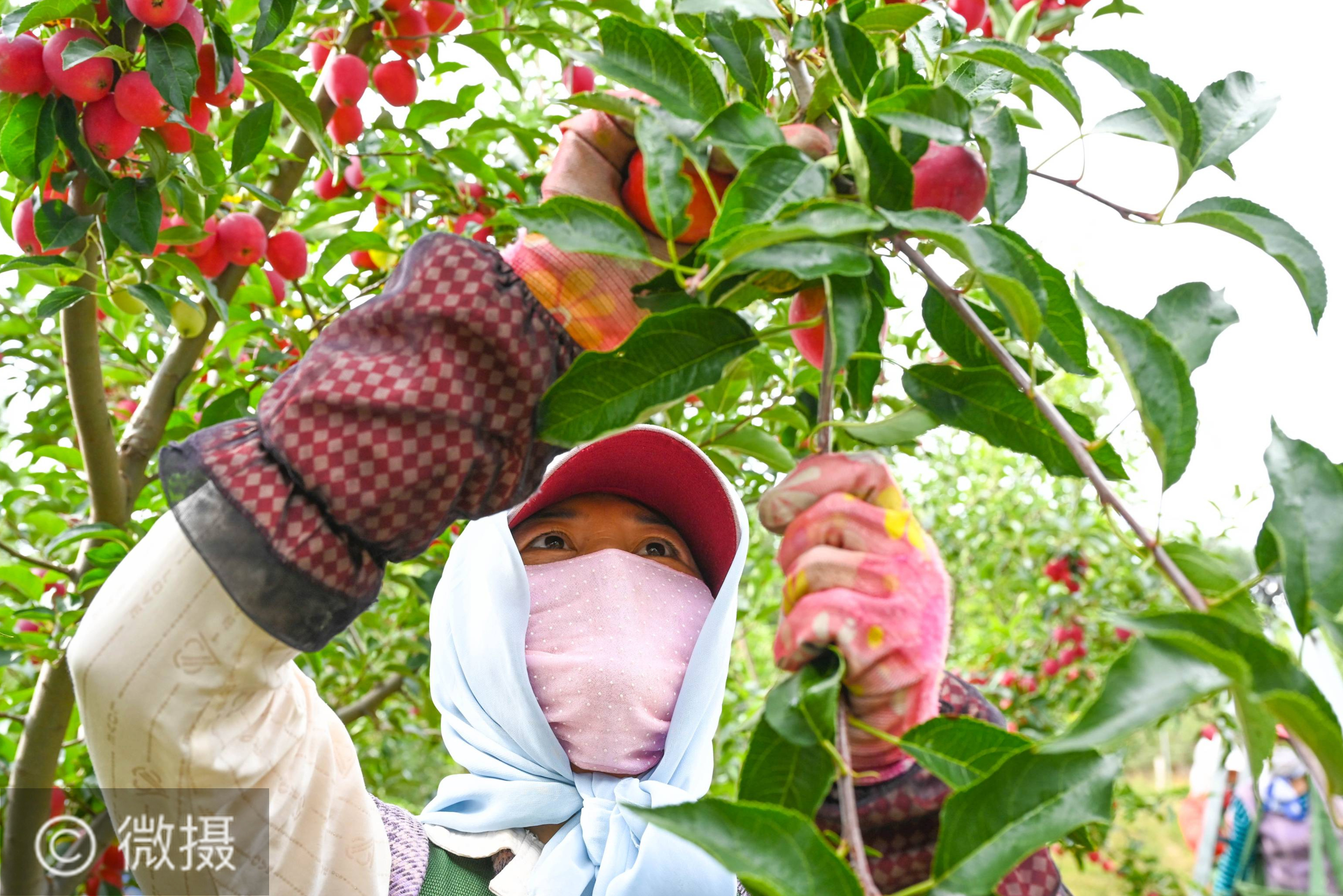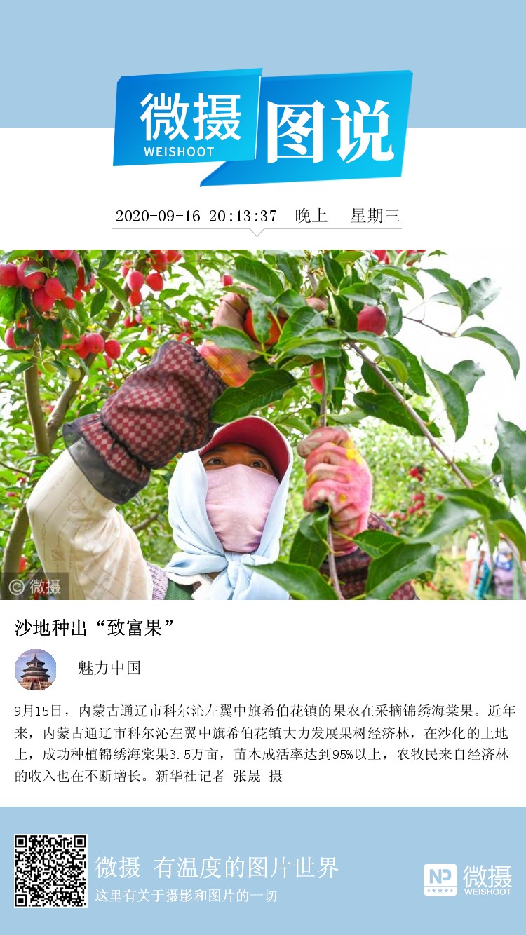 9月15日,内蒙古通辽市科尔沁左翼中旗希伯花镇的果农在采摘锦绣海棠果。近年来,内蒙古通辽市科尔沁左翼中旗希伯花镇大力发展果树经济林,在沙化的土地上,成功种植锦绣海棠果3.5万亩,苗木成活率达到95%以上,农牧民来自经济林的收入也在不断增长。新华社记者 张晟 摄