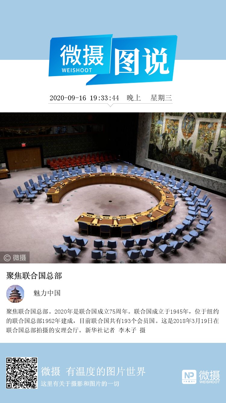 聚焦联合国总部。2020年是联合国成立75周年。联合国成立于1945年,位于纽约的联合国总部1952年建成,目前联合国共有193个会员国。这是2018年3月19日在联合国总部拍摄的安理会厅。新华社记者 李木子 摄