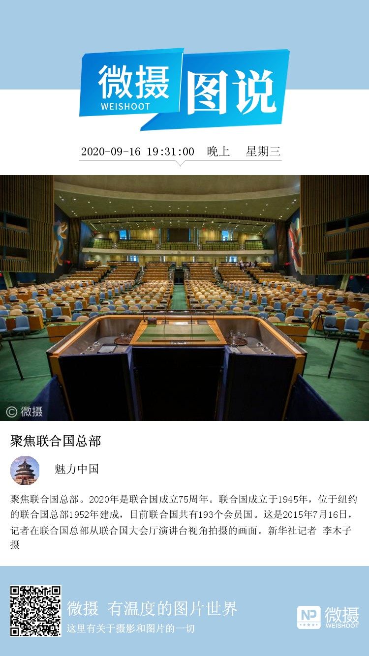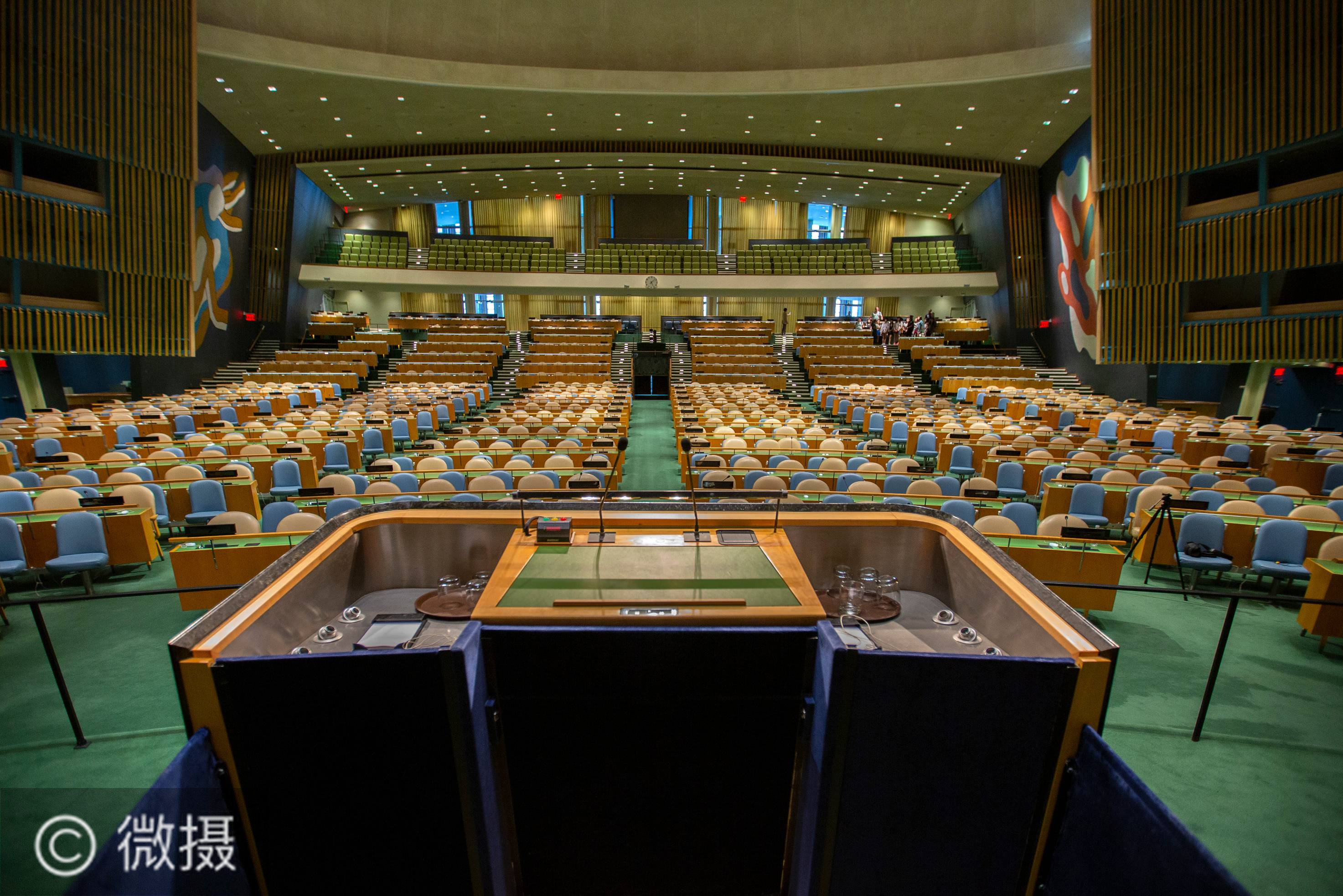 聚焦联合国总部。2020年是联合国成立75周年。联合国成立于1945年,位于纽约的联合国总部1952年建成,目前联合国共有193个会员国。这是2015年7月16日,记者在联合国总部从联合国大会厅演讲台视角拍摄的画面。新华社记者 李木子 摄