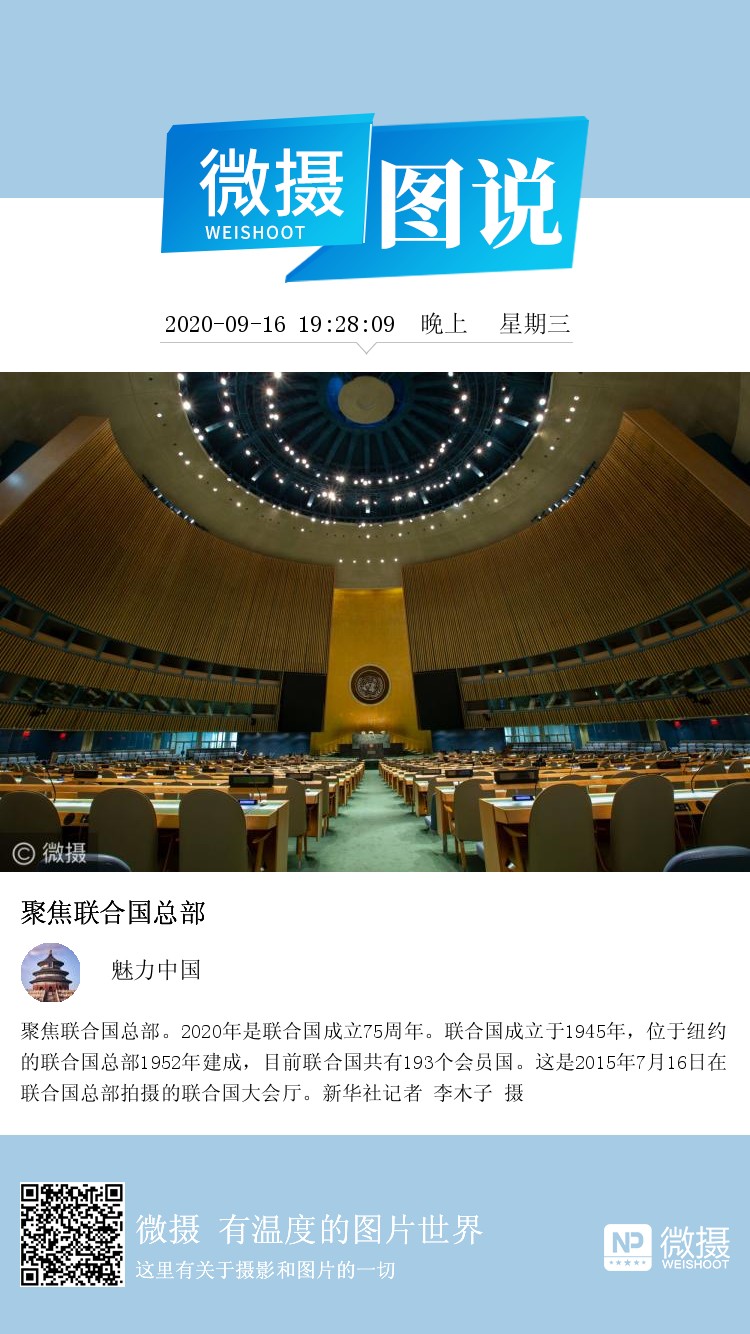 聚焦联合国总部。2020年是联合国成立75周年。联合国成立于1945年,位于纽约的联合国总部1952年建成,目前联合国共有193个会员国。这是2015年7月16日在联合国总部拍摄的联合国大会厅。新华社记者 李木子 摄