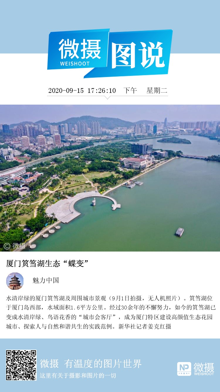 水清岸绿的厦门筼筜湖及周围城市景观(9月1日拍摄,无人机照片)。筼筜湖位于厦门岛西部,水域面积1.6平方公里。经过30余年的不懈努力,如今的筼筜湖已变成水清岸绿、鸟语花香的“城市会客厅”,成为厦门特区建设高颜值生态花园城市、探索人与自然和谐共生的实践范例。新华社记者姜克红摄