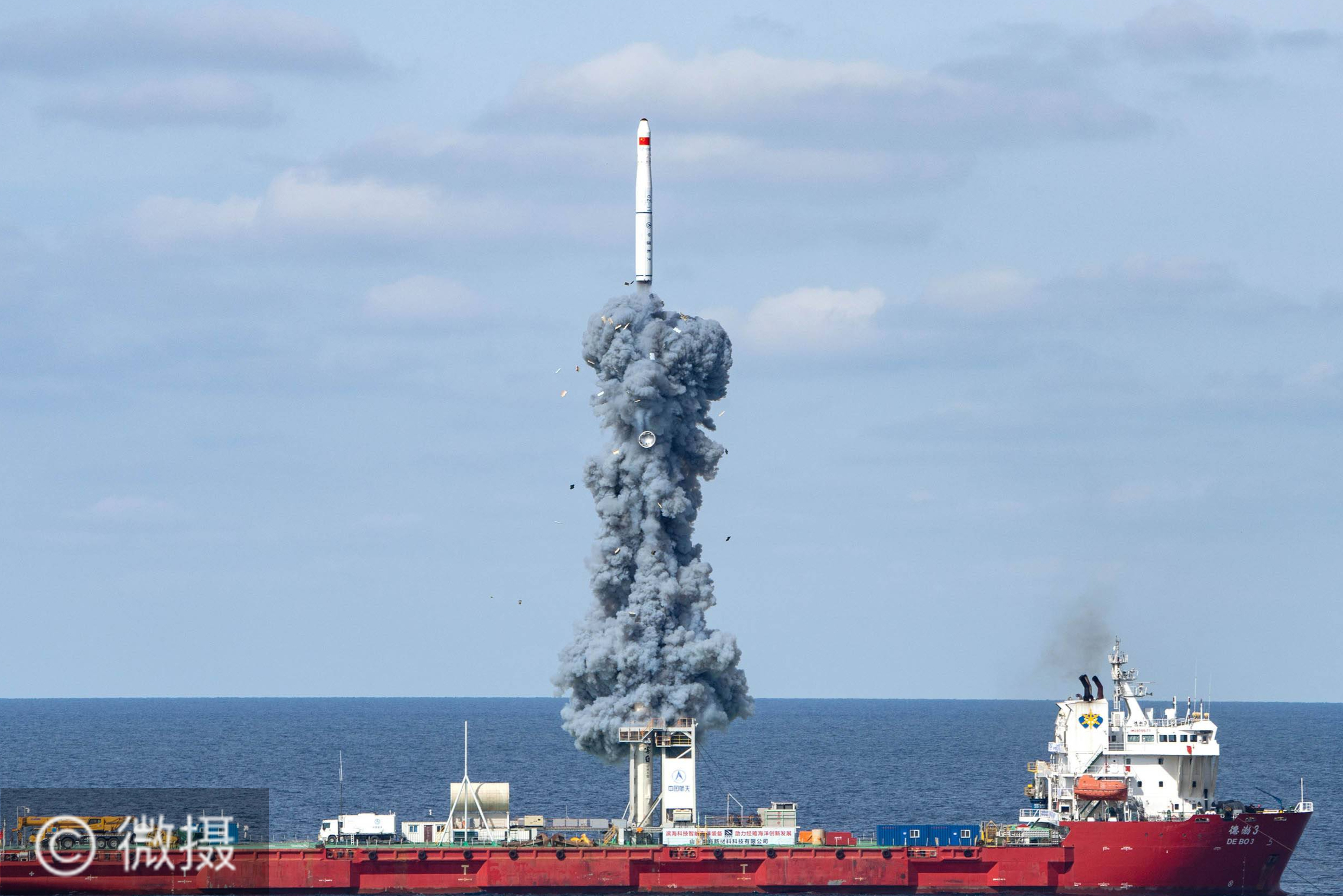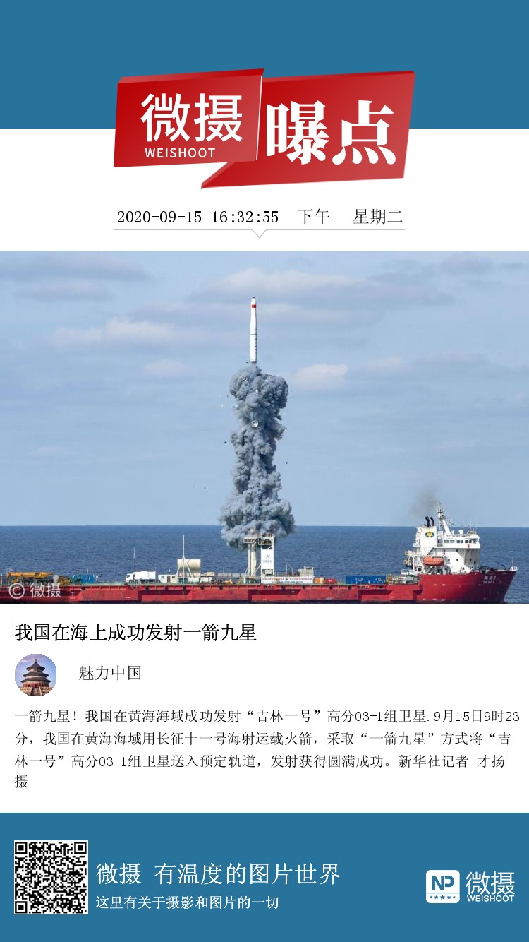 一箭九星!我国在黄海海域成功发射“吉林一号”高分03-1组卫星.9月15日9时23分,我国在黄海海域用长征十一号海射运载火箭,采取“一箭九星”方式将“吉林一号”高分03-1组卫星送入预定轨道,发射获得圆满成功。新华社记者 才扬 摄