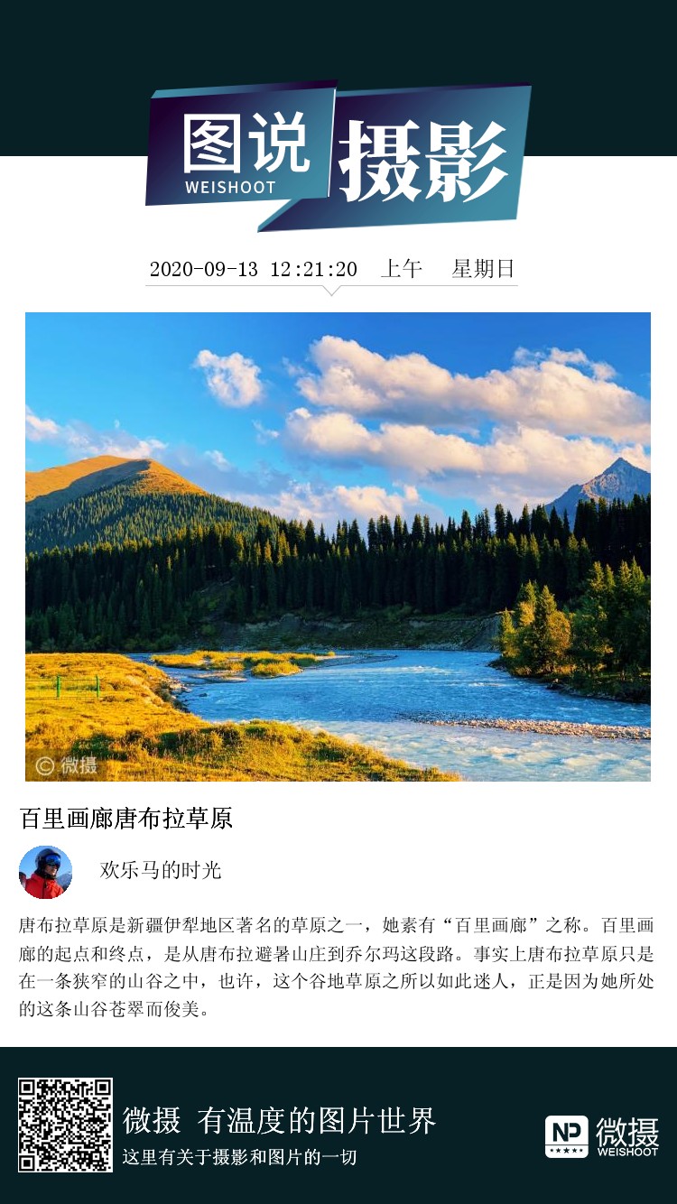 唐布拉草原是新疆伊犁地区著名的草原之一,她素有“百里画廊”之称。百里画廊的起点和终点,是从唐布拉避暑山庄到乔尔玛这段路。事实上唐布拉草原只是在一条狭窄的山谷之中,也许,这个谷地草原之所以如此迷人,正是因为她所处的这条山谷苍翠而俊美。