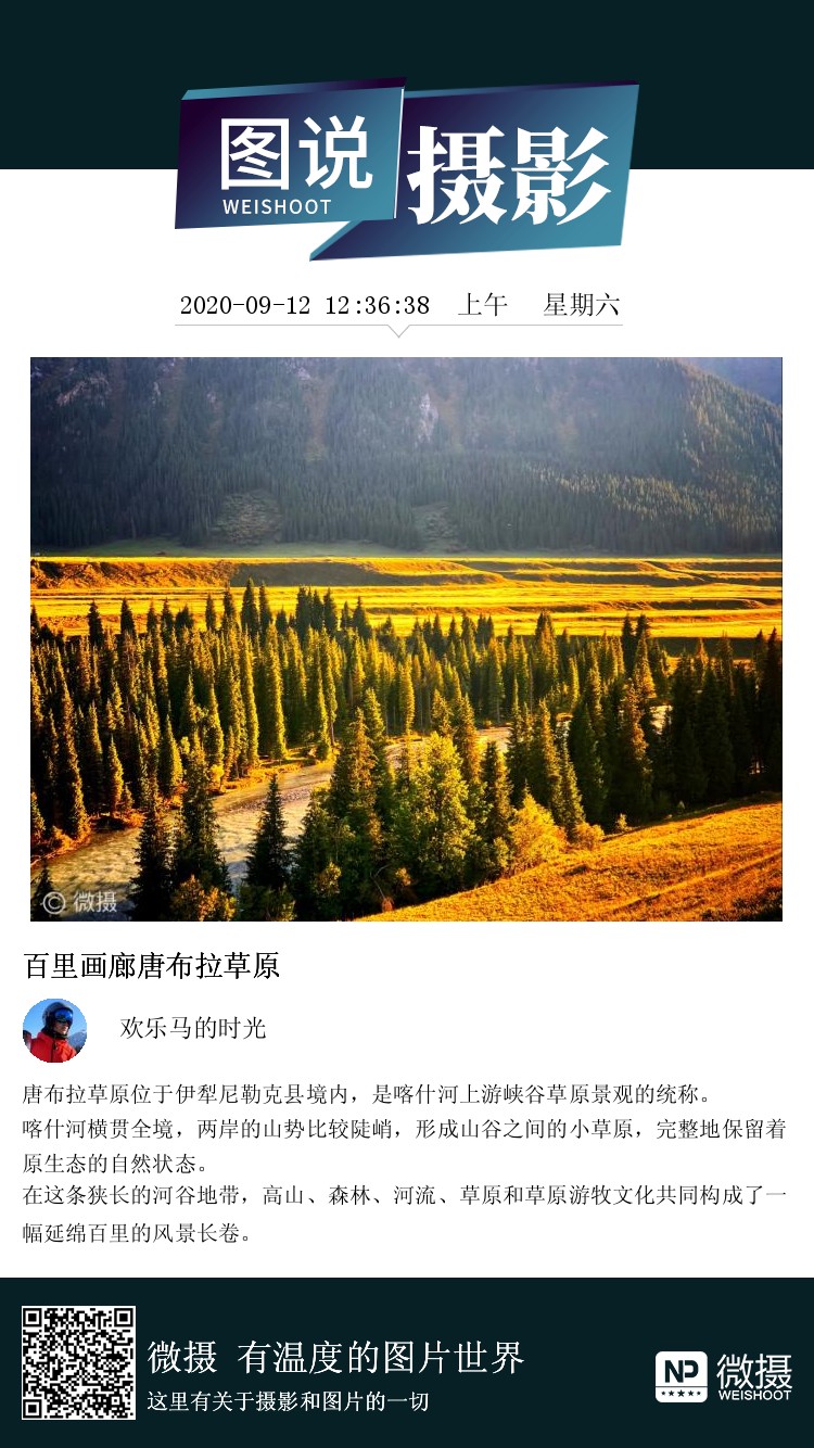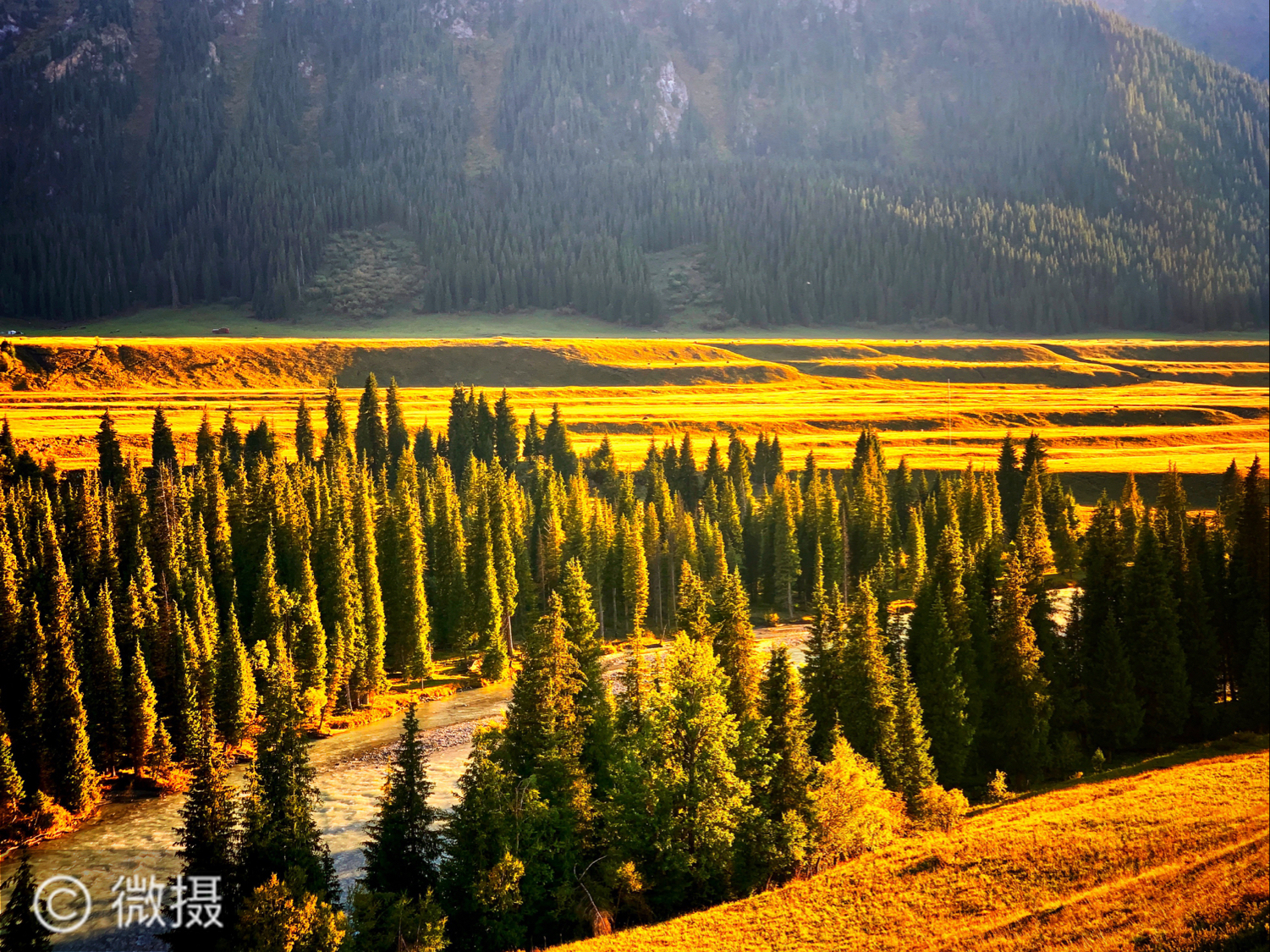 唐布拉草原位于伊犁尼勒克县境内,是喀什河上游峡谷草原景观的统称。 喀什河横贯全境,两岸的山势比较陡峭,形成山谷之间的小草原,完整地保留着原生态的自然状态。 在这条狭长的河谷地带,高山、森林、河流、草原和草原游牧文化共同构成了一幅延绵百里的风景长卷。
