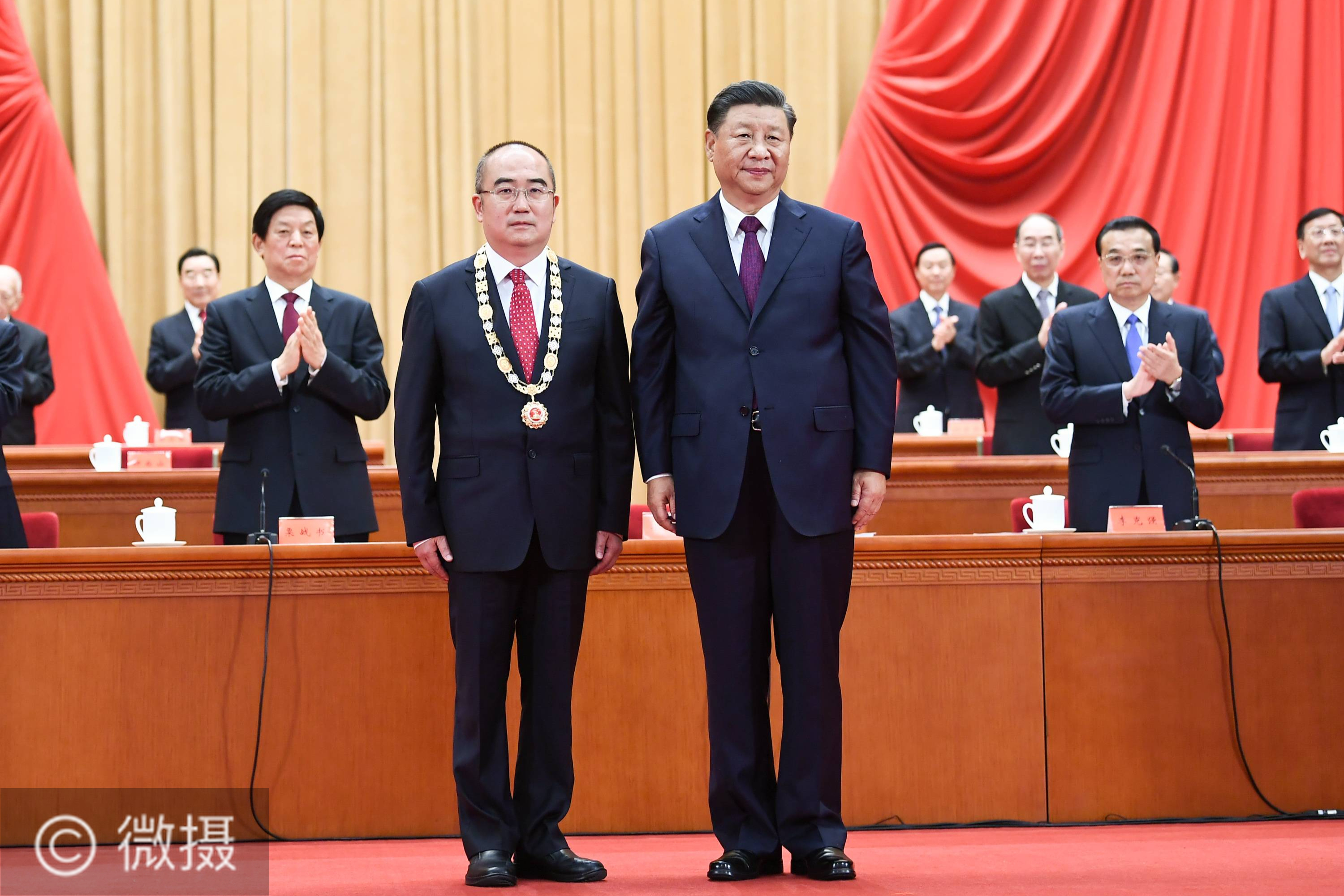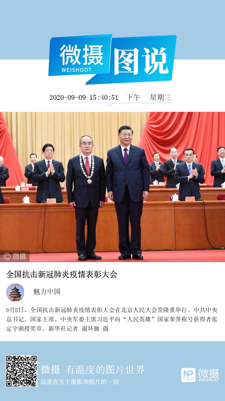 9月8日,全国抗击新冠肺炎疫情表彰大会在北京人民大会堂隆重举行。中共中央总书记、国家主席、中央军委主席习近平向“人民英雄”国家荣誉称号获得者张定宇颁授奖章。新华社记者 谢环驰 摄