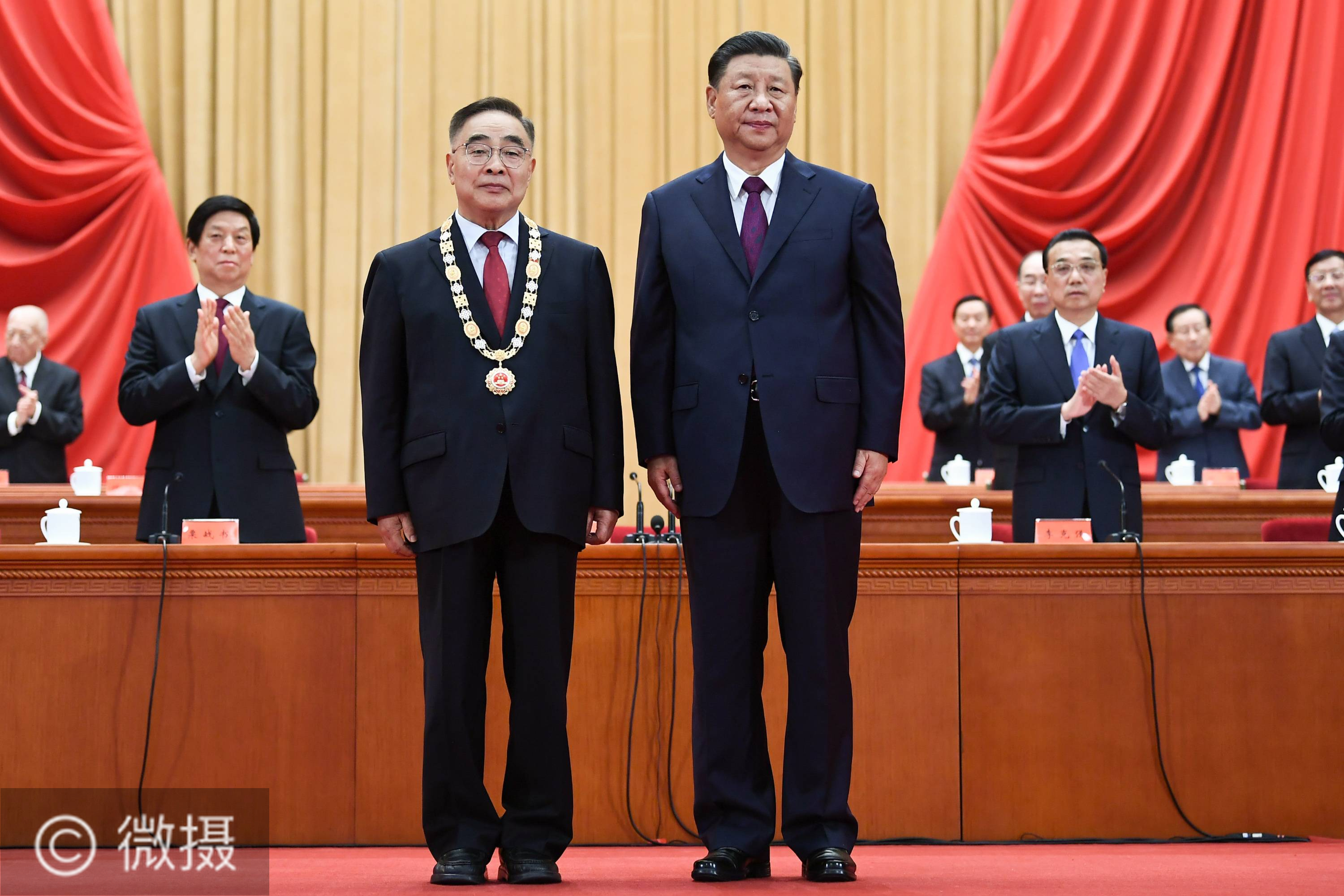 9月8日,全国抗击新冠肺炎疫情表彰大会在北京人民大会堂隆重举行。中共中央总书记、国家主席、中央军委主席习近平向“人民英雄”国家荣誉称号获得者张伯礼颁授奖章。新华社记者 谢环驰 摄