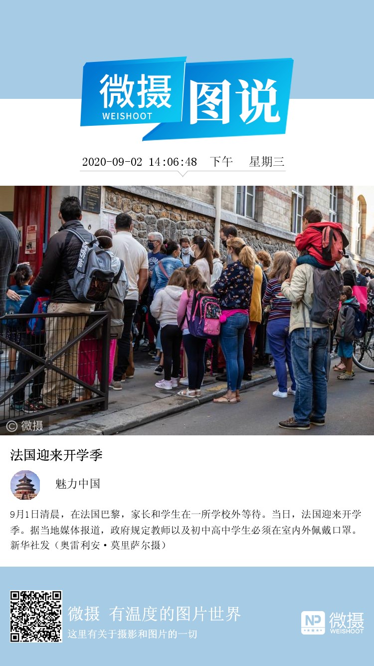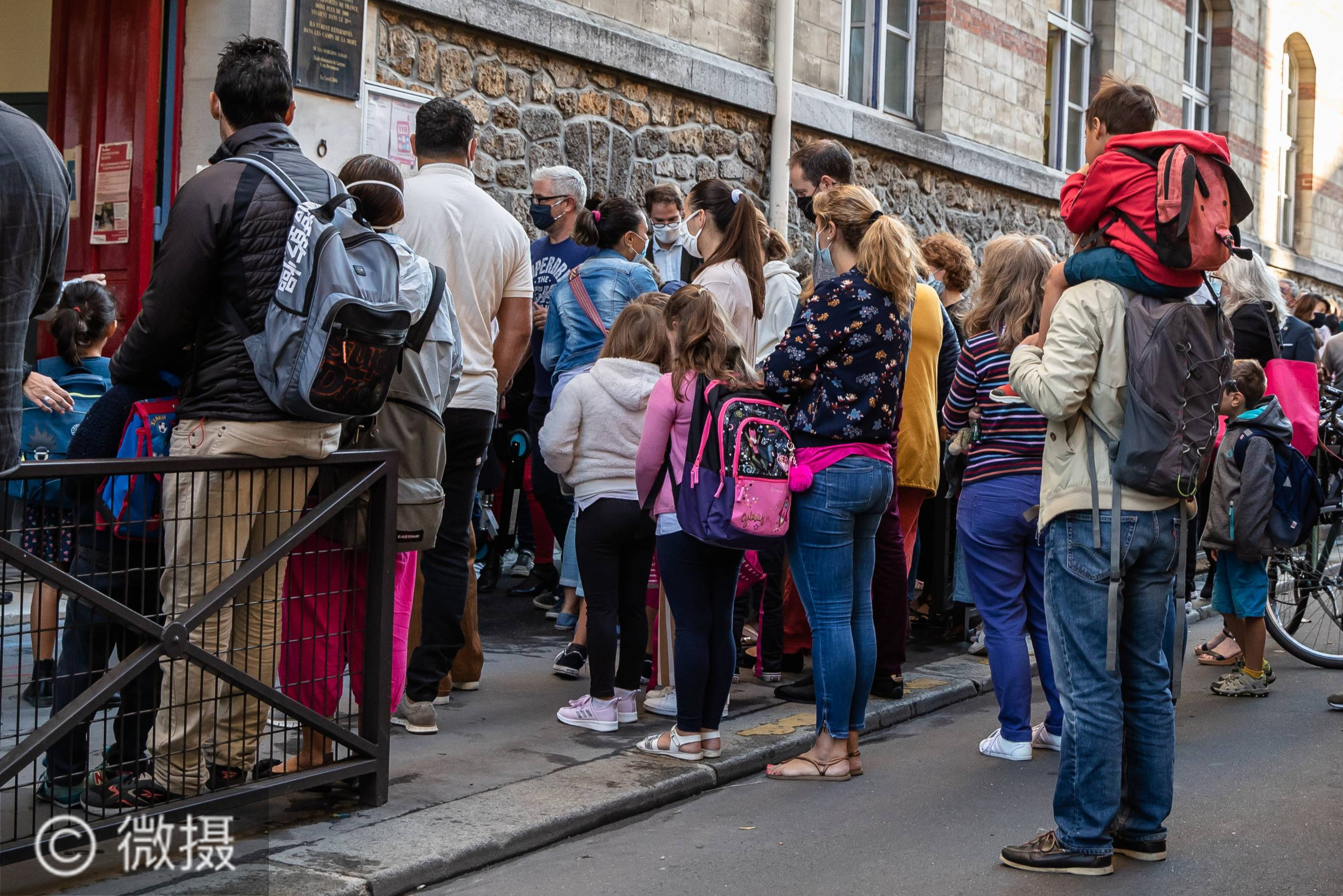 9月1日清晨,在法国巴黎,家长和学生在一所学校外等待。当日,法国迎来开学季。据当地媒体报道,政府规定教师以及初中高中学生必须在室内外佩戴口罩。新华社发(奥雷利安·莫里萨尔摄)