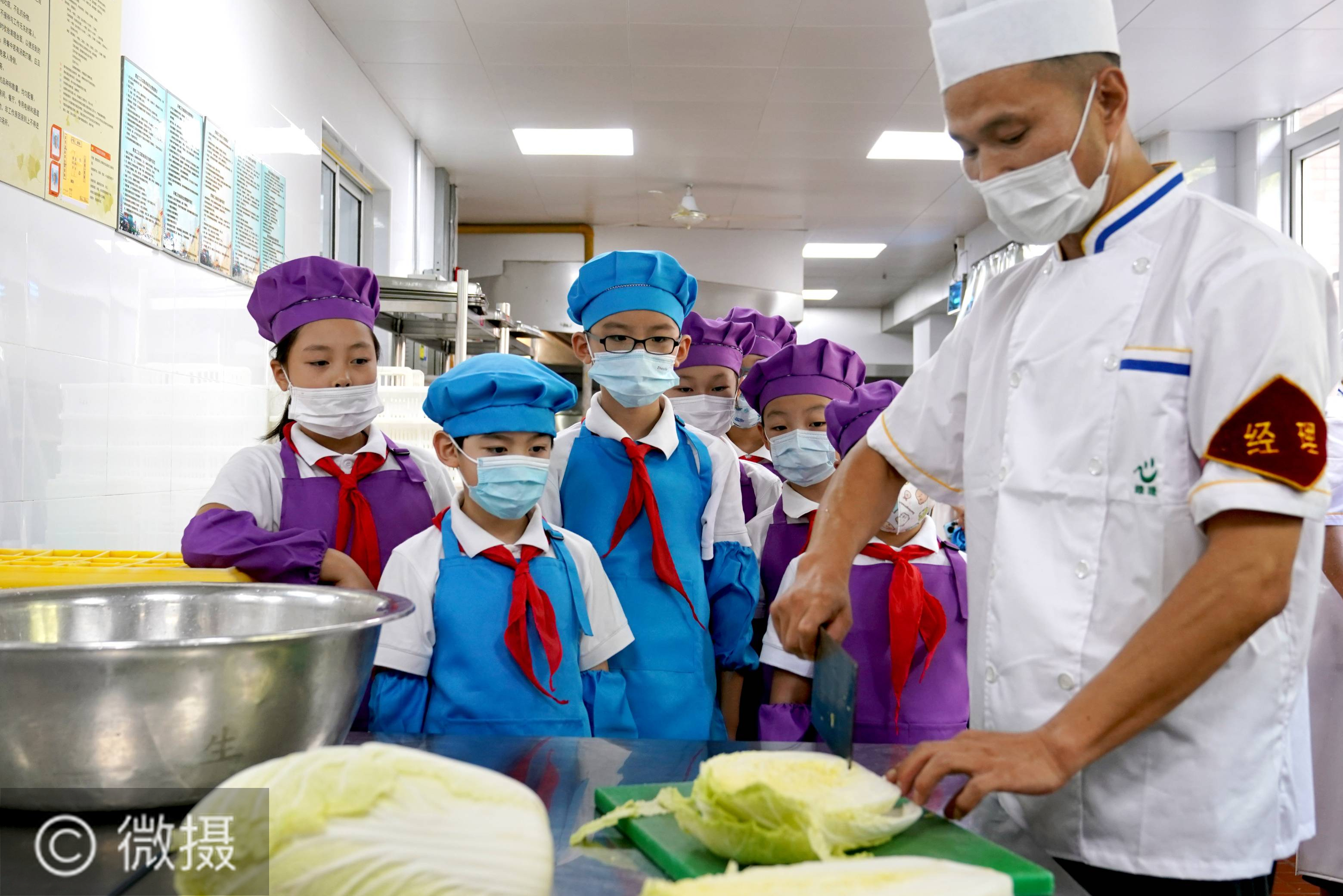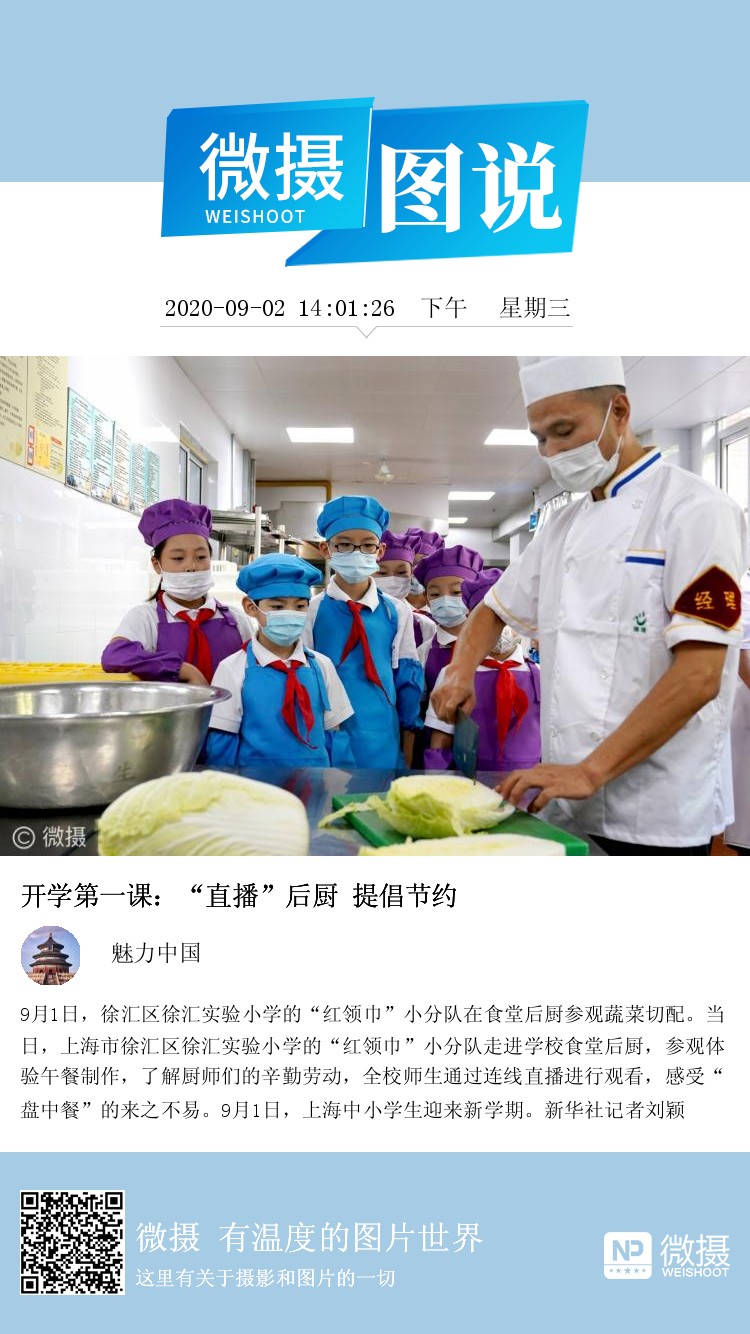 9月1日,徐汇区徐汇实验小学的“红领巾”小分队在食堂后厨参观蔬菜切配。当日,上海市徐汇区徐汇实验小学的“红领巾”小分队走进学校食堂后厨,参观体验午餐制作,了解厨师们的辛勤劳动,全校师生通过连线直播进行观看,感受“盘中餐”的来之不易。9月1日,上海中小学生迎来新学期。新华社记者刘颖