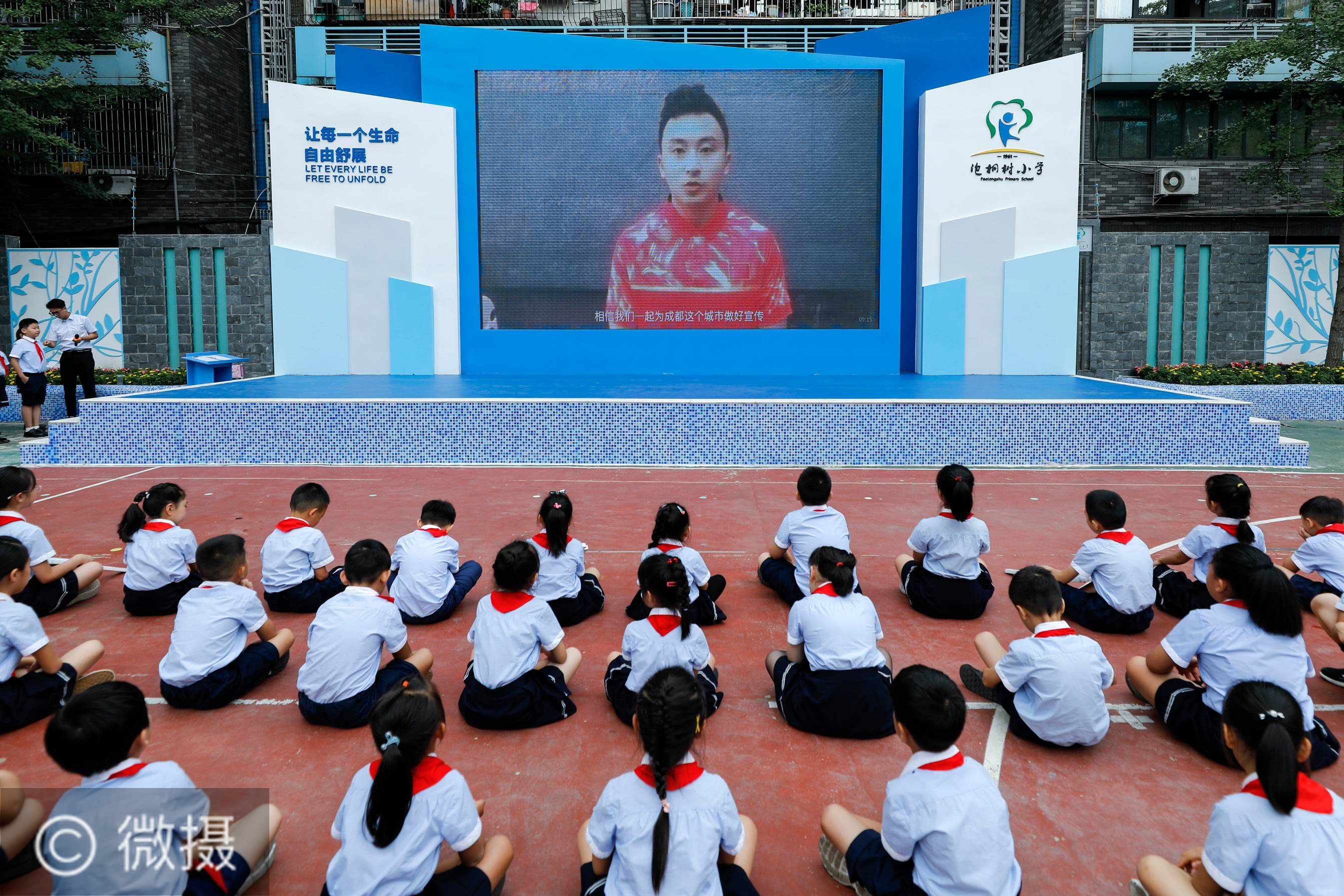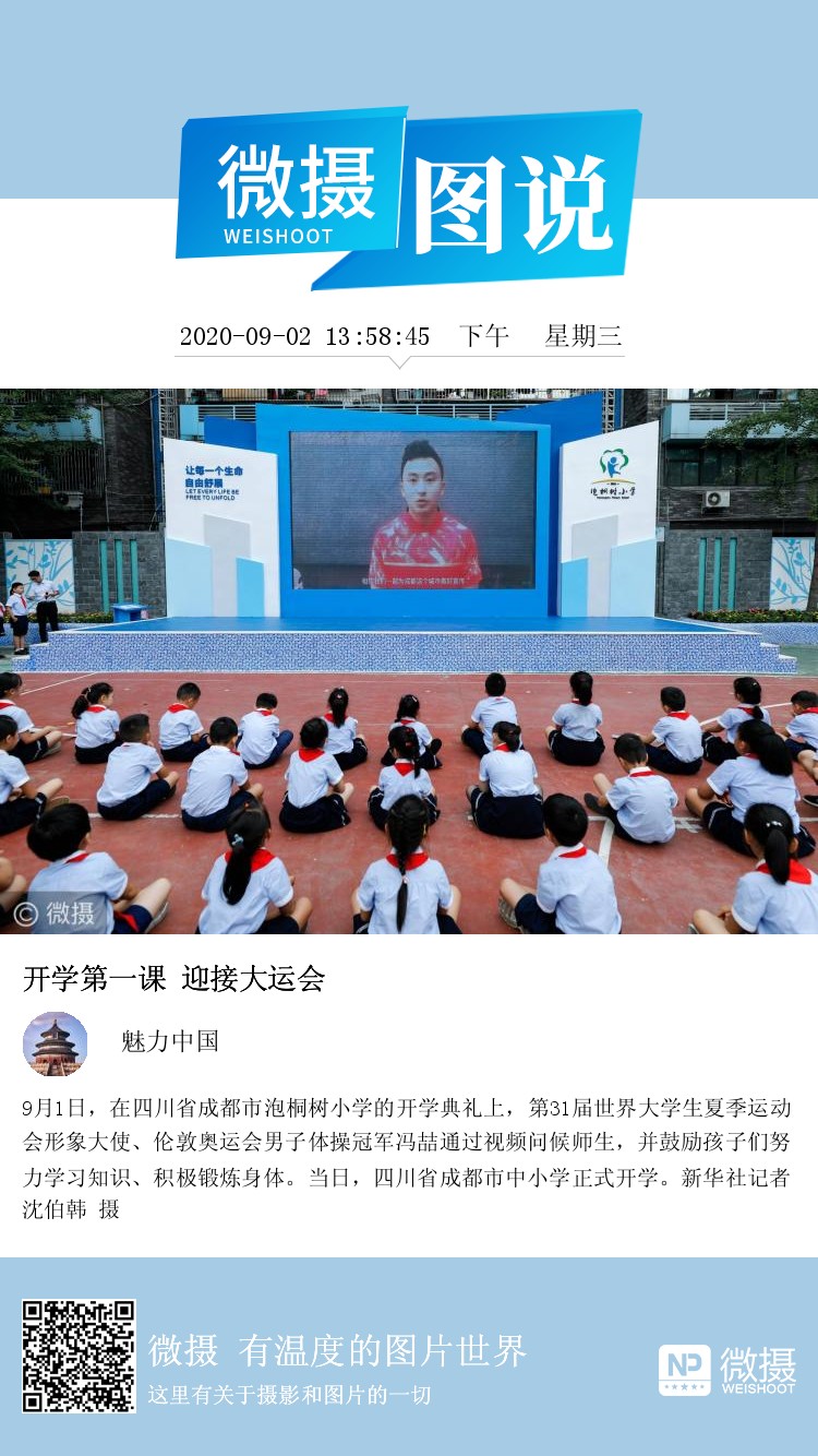9月1日,在四川省成都市泡桐树小学的开学典礼上,第31届世界大学生夏季运动会形象大使、伦敦奥运会男子体操冠军冯喆通过视频问候师生,并鼓励孩子们努力学习知识、积极锻炼身体。当日,四川省成都市中小学正式开学。新华社记者 沈伯韩 摄