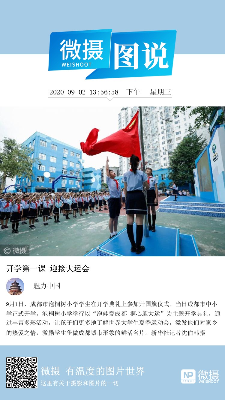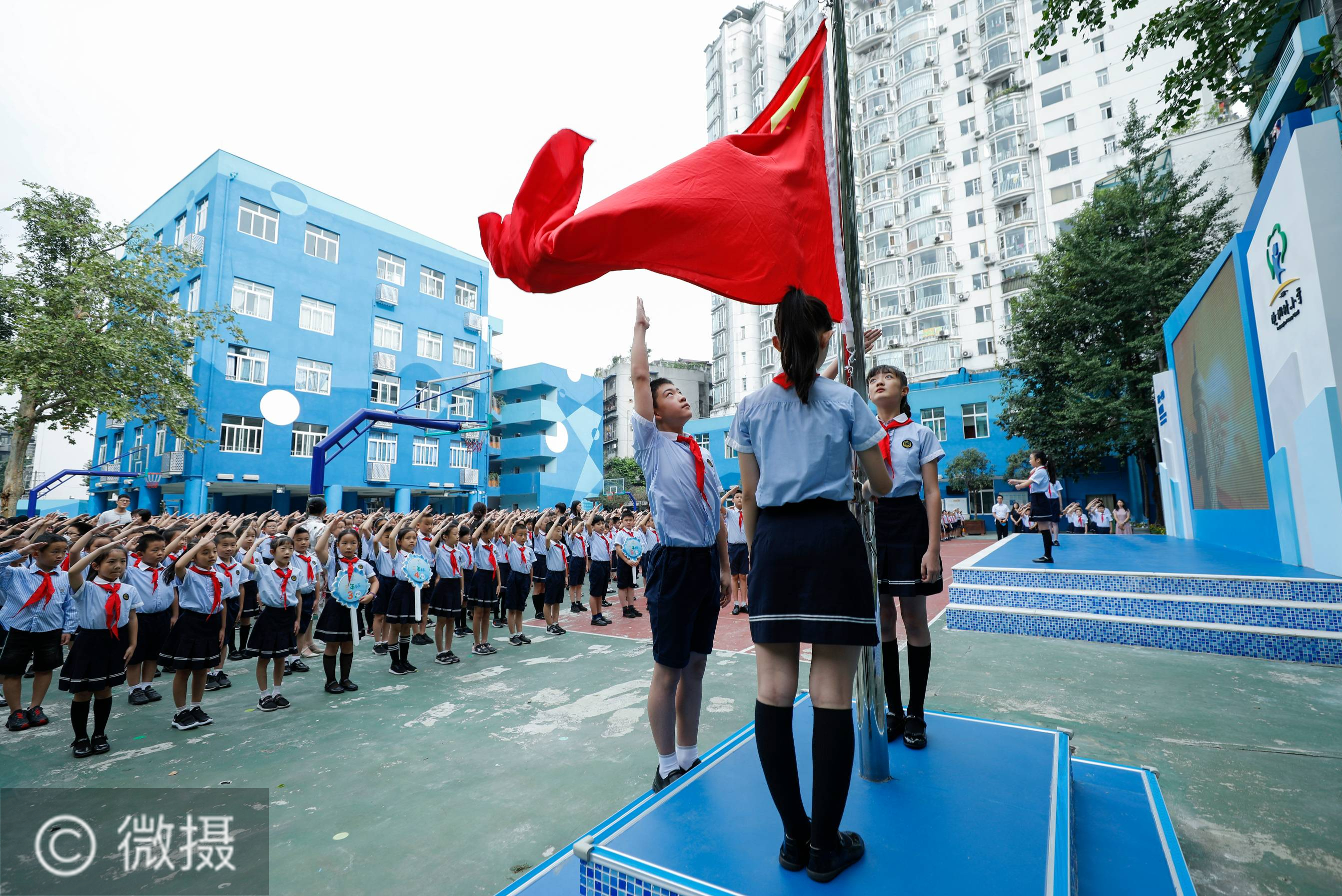 9月1日,成都市泡桐树小学学生在开学典礼上参加升国旗仪式。当日成都市中小学正式开学,泡桐树小学举行以“泡娃爱成都 桐心迎大运”为主题开学典礼,通过丰富多彩活动,让孩子们更多地了解世界大学生夏季运动会,激发他们对家乡的热爱之情,激励学生争做成都城市形象的鲜活名片。新华社记者沈伯韩摄