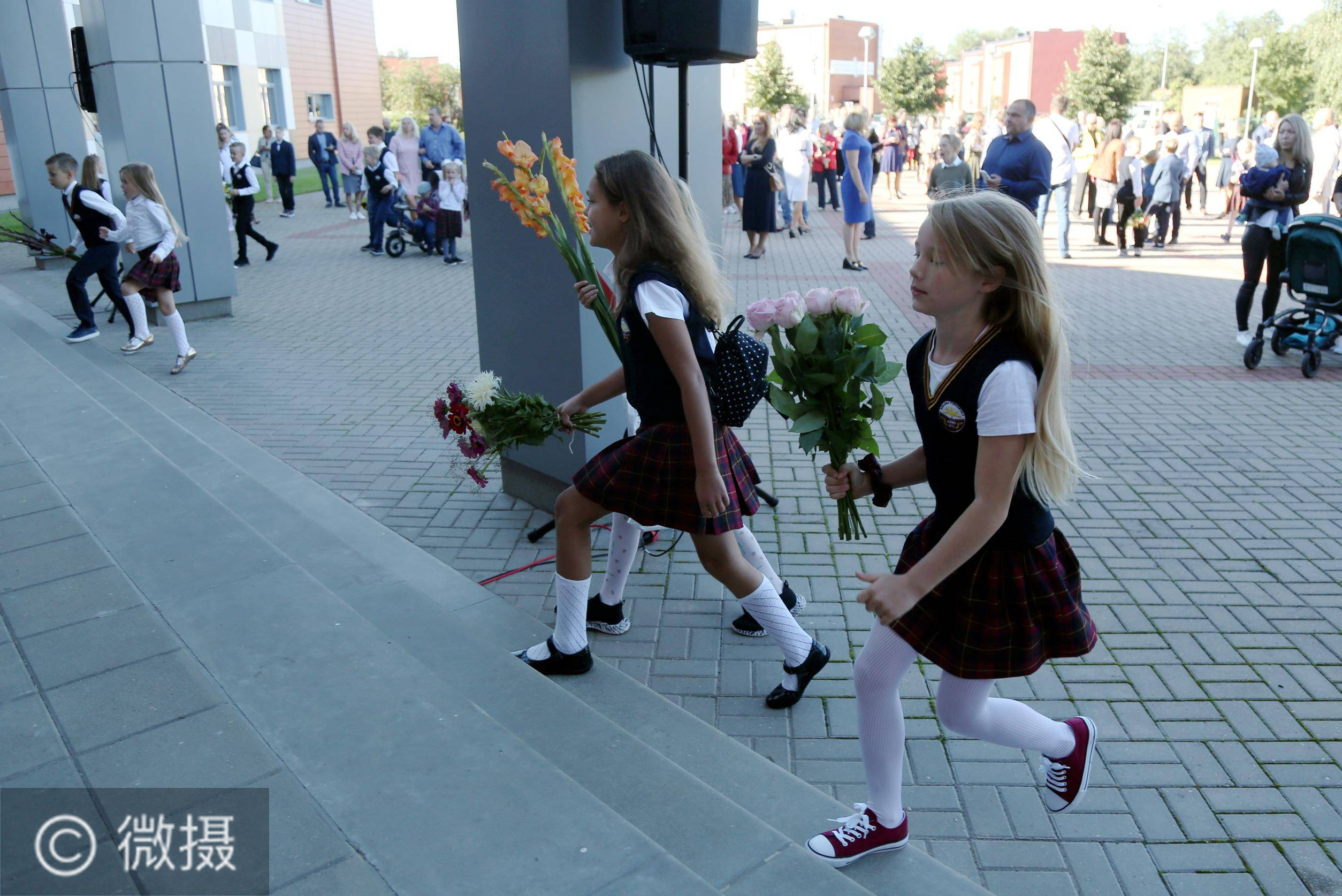 拉脱维亚:迎接新学年。9月1日,学生进入拉脱维亚科卡瓦的一所学校。当日,拉脱维亚迎来新学年。新华社发(艾迪斯摄)