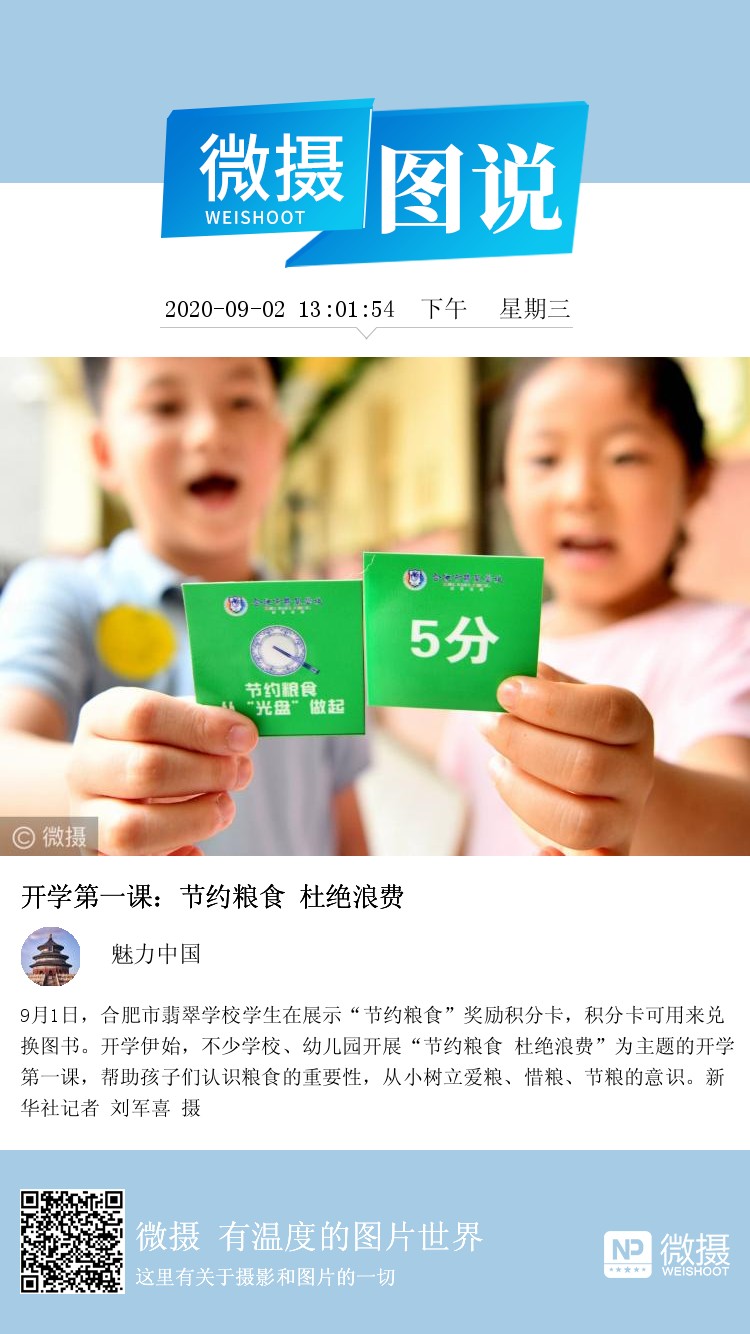 9月1日,合肥市翡翠学校学生在展示“节约粮食”奖励积分卡,积分卡可用来兑换图书。开学伊始,不少学校、幼儿园开展“节约粮食 杜绝浪费”为主题的开学第一课,帮助孩子们认识粮食的重要性,从小树立爱粮、惜粮、节粮的意识。新华社记者 刘军喜 摄