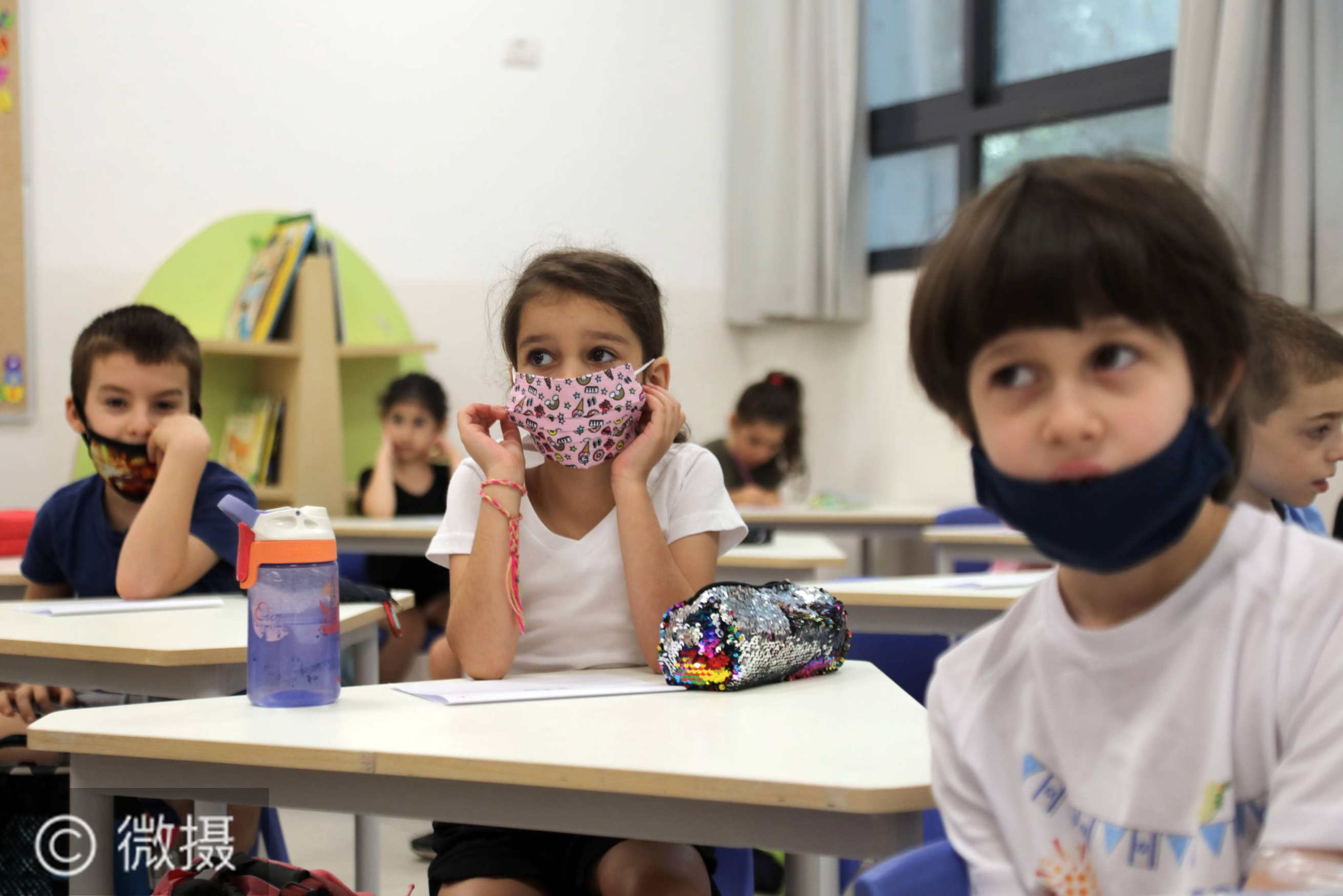 这是9月1日在以色列中部城市特拉维夫一所小学的教室内拍摄的佩戴口罩的学生。以色列中小学的新学年于9月1日开始,低年级(1至4年级)进行小班教学,中高年级(5至12年级)则主要是远程在线学习。新华社/基尼图片社
