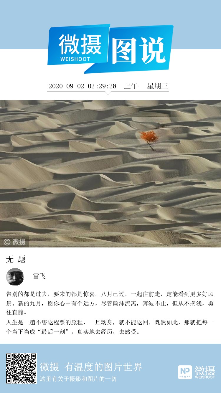 告别的都是过去,要来的都是惊喜。八月已过,一起往前走,定能看到更多好风景。新的九月,愿你心中有个远方,尽管颠沛流离,奔波不止,但从不搁浅,勇往直前。 人生是一趟不售返程票的旅程,一旦动身,就不能返回。既然如此,那就把每一个当下当成“最后一刻”,真实地去经历,去感受。