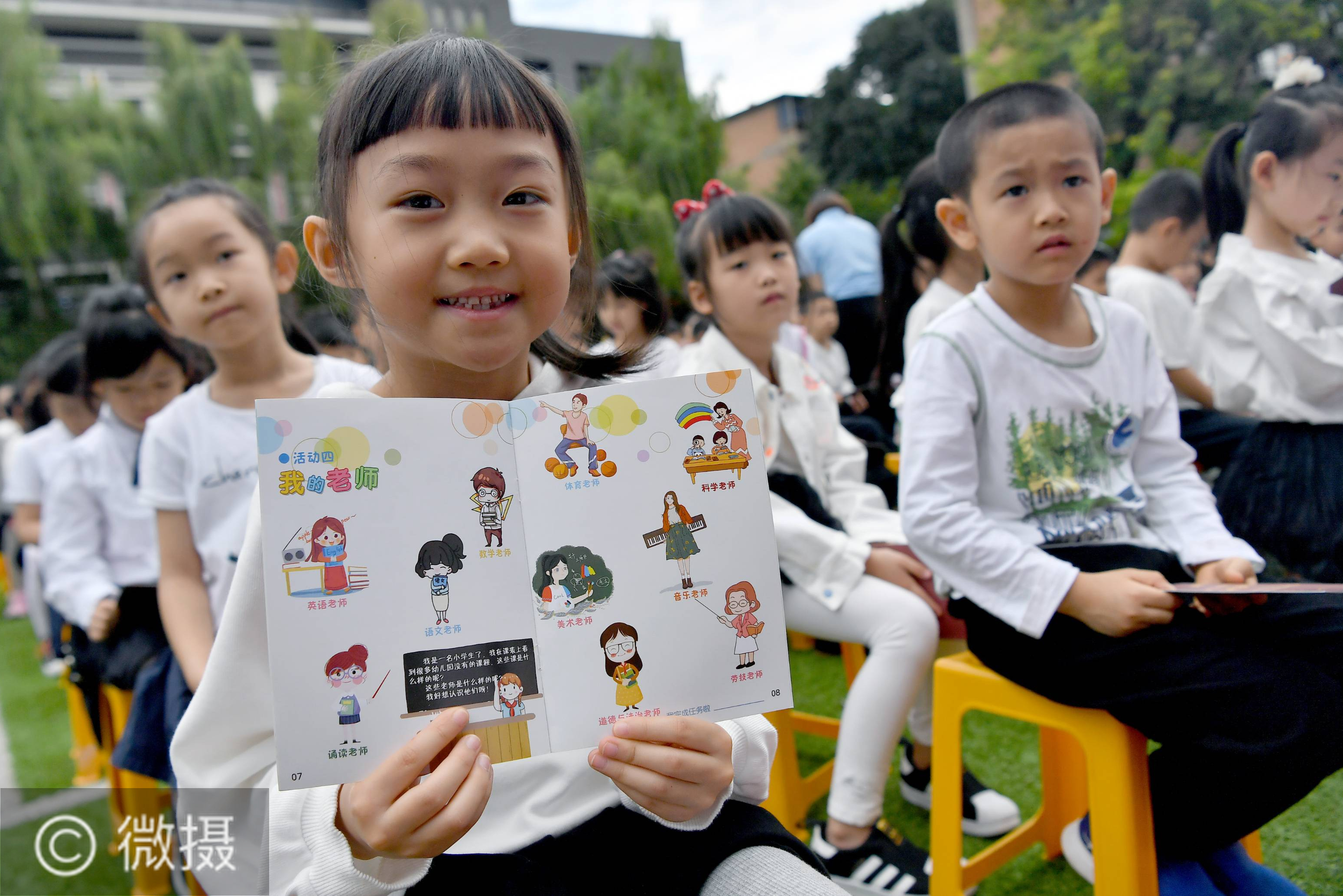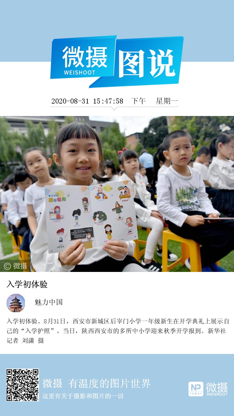 入学初体验。8月31日,西安市新城区后宰门小学一年级新生在开学典礼上展示自己的“入学护照”。当日,陕西西安市的多所中小学迎来秋季开学报到。新华社记者 刘潇 摄