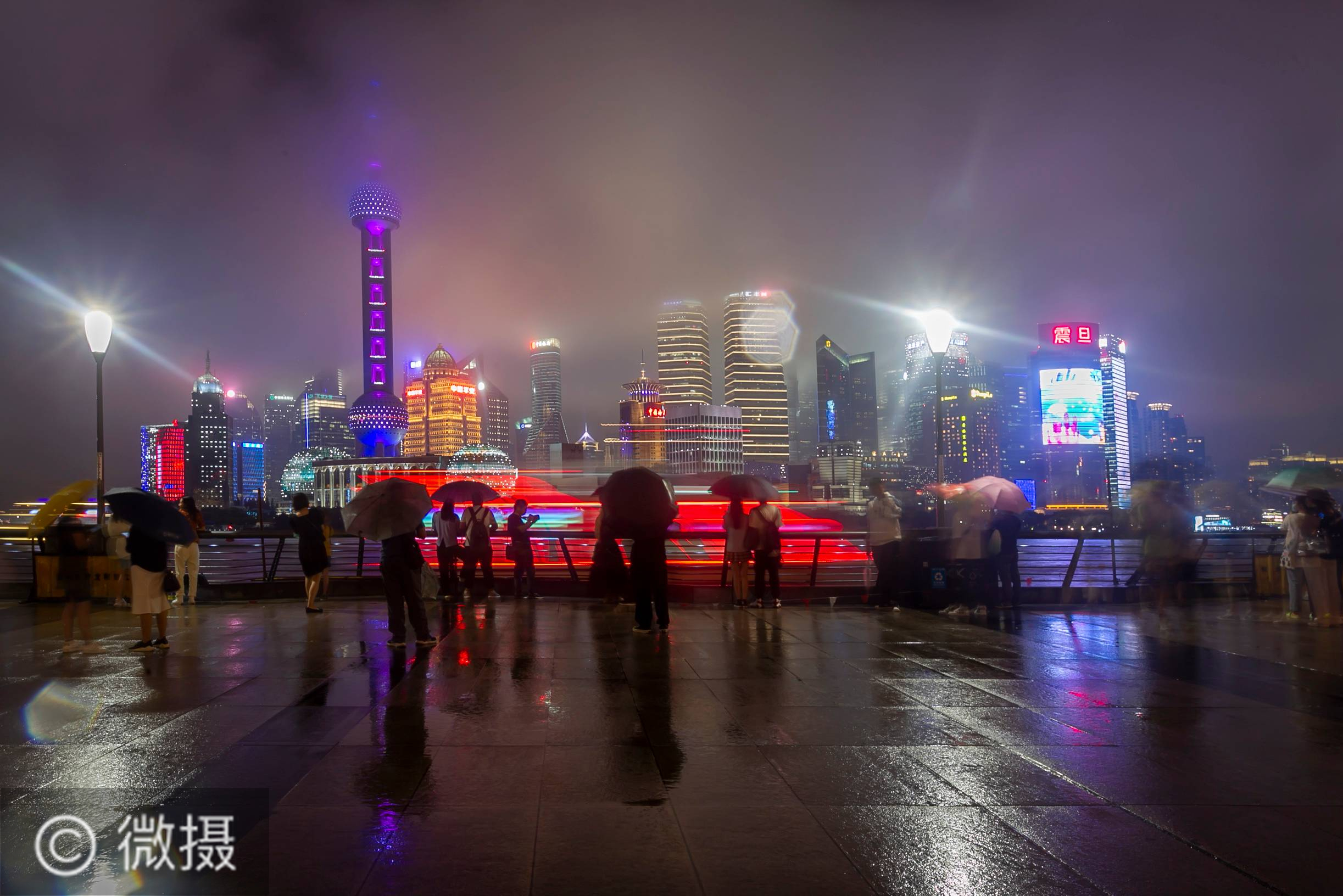 上海雨夜美。8月28日,人们冒雨在上海外滩游览。8月28日晚,受较强的降水云团影响,上海部分地区迎来短时强降水。雨夜的上海别样美丽。新华社记者 王翔 摄
