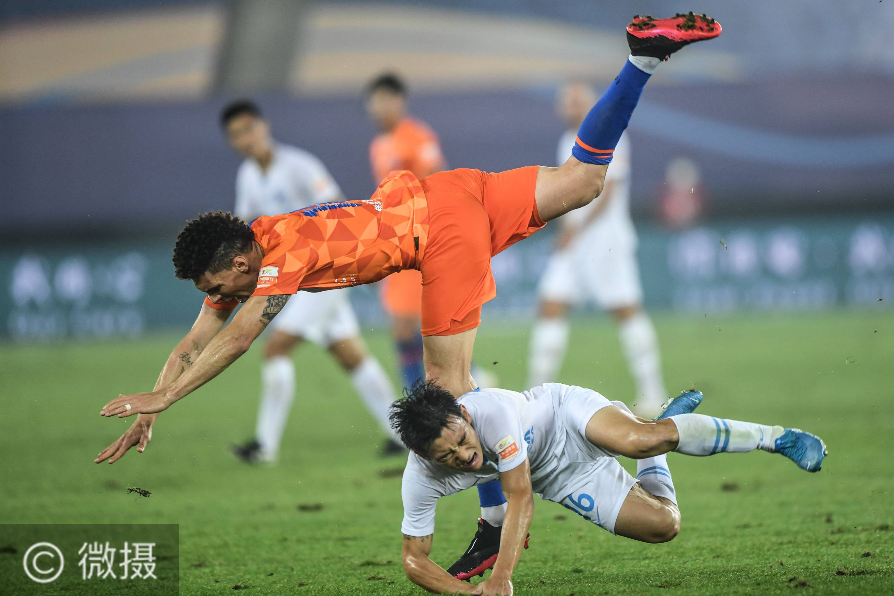 8月29日,大连人队球员童磊(下)与山东鲁能泰山队球员莫伊塞斯在拼抢时双双摔倒。当日,在2020中国足球协会超级联赛(大连赛区)第八轮比赛中,大连人队1比0战胜山东鲁能泰山队,获得本赛季首场胜利。新华社记者潘昱龙摄