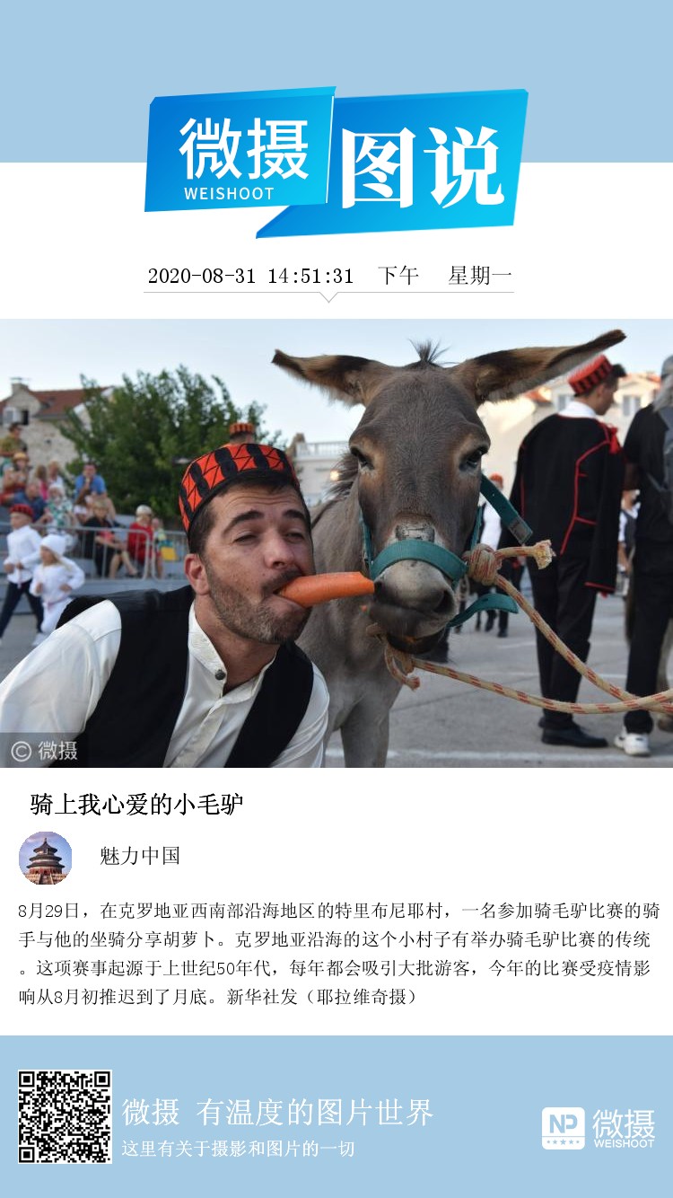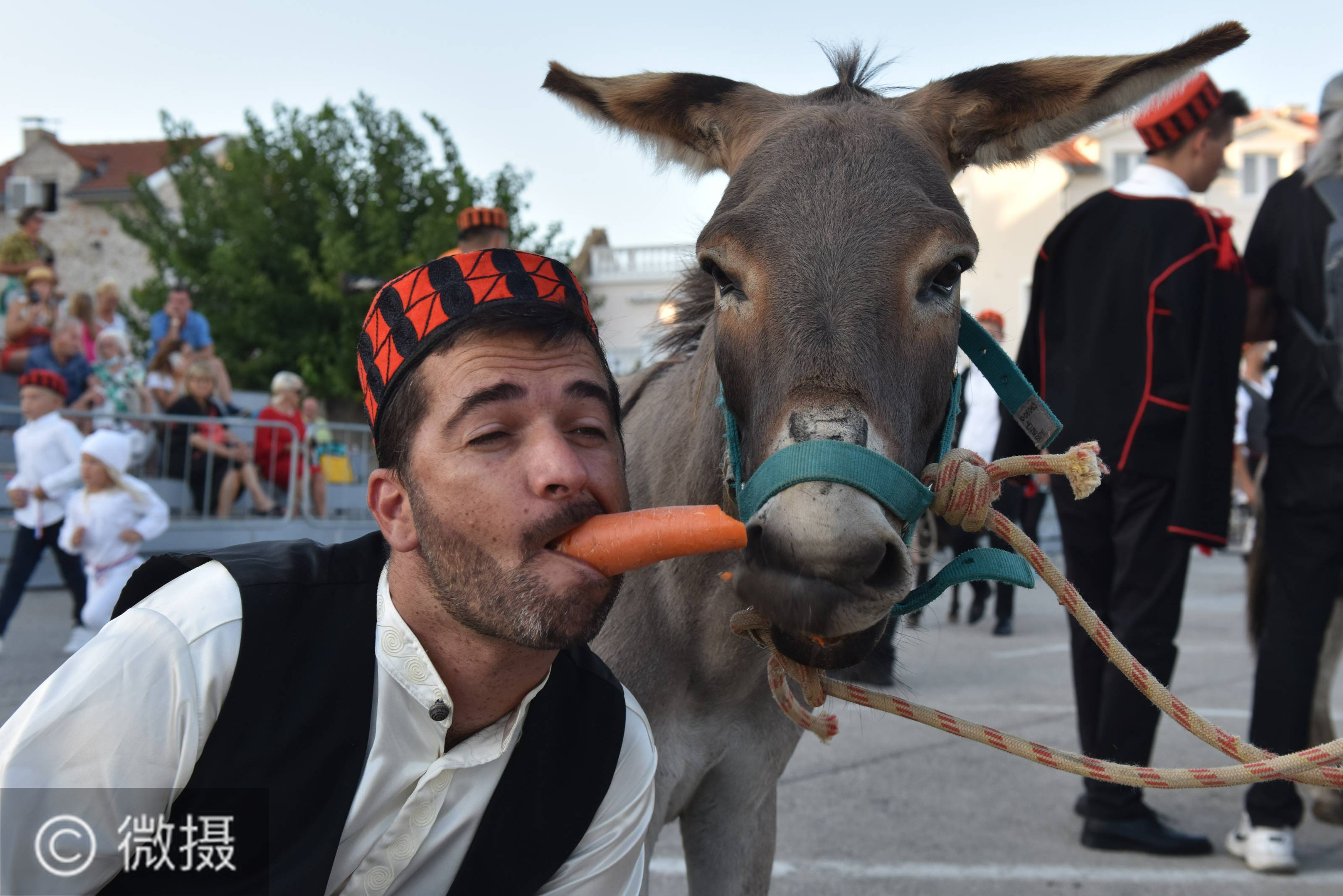 8月29日,在克罗地亚西南部沿海地区的特里布尼耶村,一名参加骑毛驴比赛的骑手与他的坐骑分享胡萝卜。克罗地亚沿海的这个小村子有举办骑毛驴比赛的传统。这项赛事起源于上世纪50年代,每年都会吸引大批游客,今年的比赛受疫情影响从8月初推迟到了月底。新华社发(耶拉维奇摄)