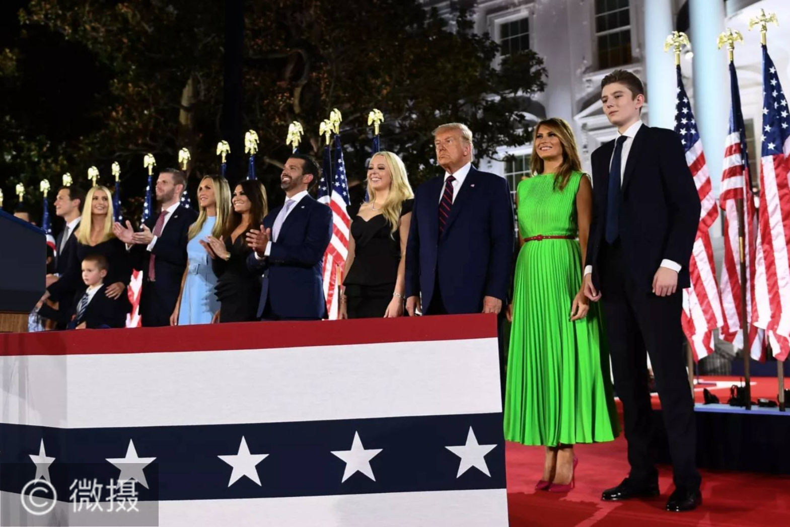 2020年8月27日,美国总统唐纳德·特朗普在为共和党提名接受致词时被家人包围。梅拉尼娅·特朗普的霓虹绿连衣裙转移了网络注意力。当她的丈夫正式被选为共和党总统大选候选人时,梅拉尼娅·特朗普本周四穿着淡绿色的连衣裙出现,这激发了互联网用户的想象力。布伦丹·斯米亚洛夫斯基/摄影