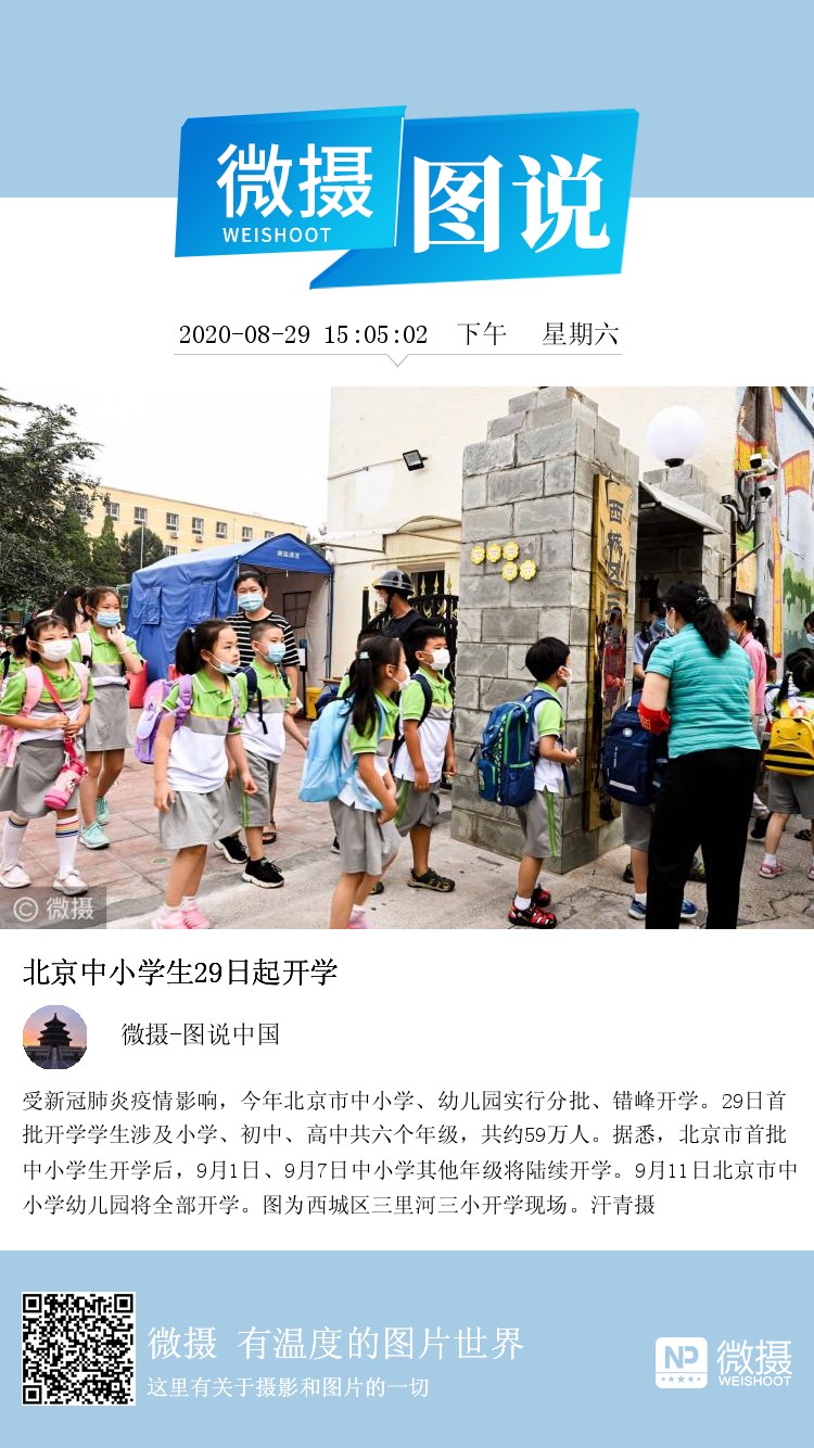 受新冠肺炎疫情影响,今年北京市中小学、幼儿园实行分批、错峰开学。29日首批开学学生涉及小学、初中、高中共六个年级,共约59万人。据悉,北京市首批中小学生开学后,9月1日、9月7日中小学其他年级将陆续开学。9月11日北京市中小学幼儿园将全部开学。图为西城区三里河三小开学现场。汗青摄