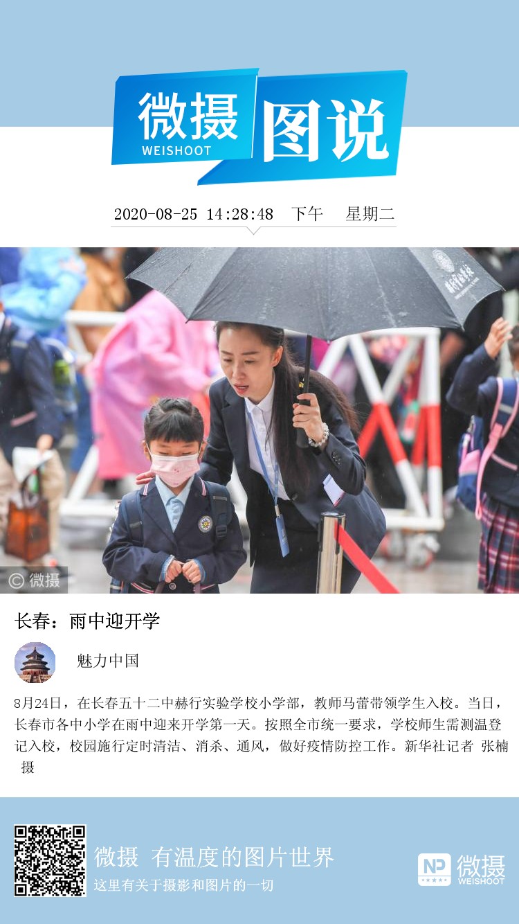 8月24日,在长春五十二中赫行实验学校小学部,教师马蕾带领学生入校。当日,长春市各中小学在雨中迎来开学第一天。按照全市统一要求,学校师生需测温登记入校,校园施行定时清洁、消杀、通风,做好疫情防控工作。新华社记者 张楠 摄