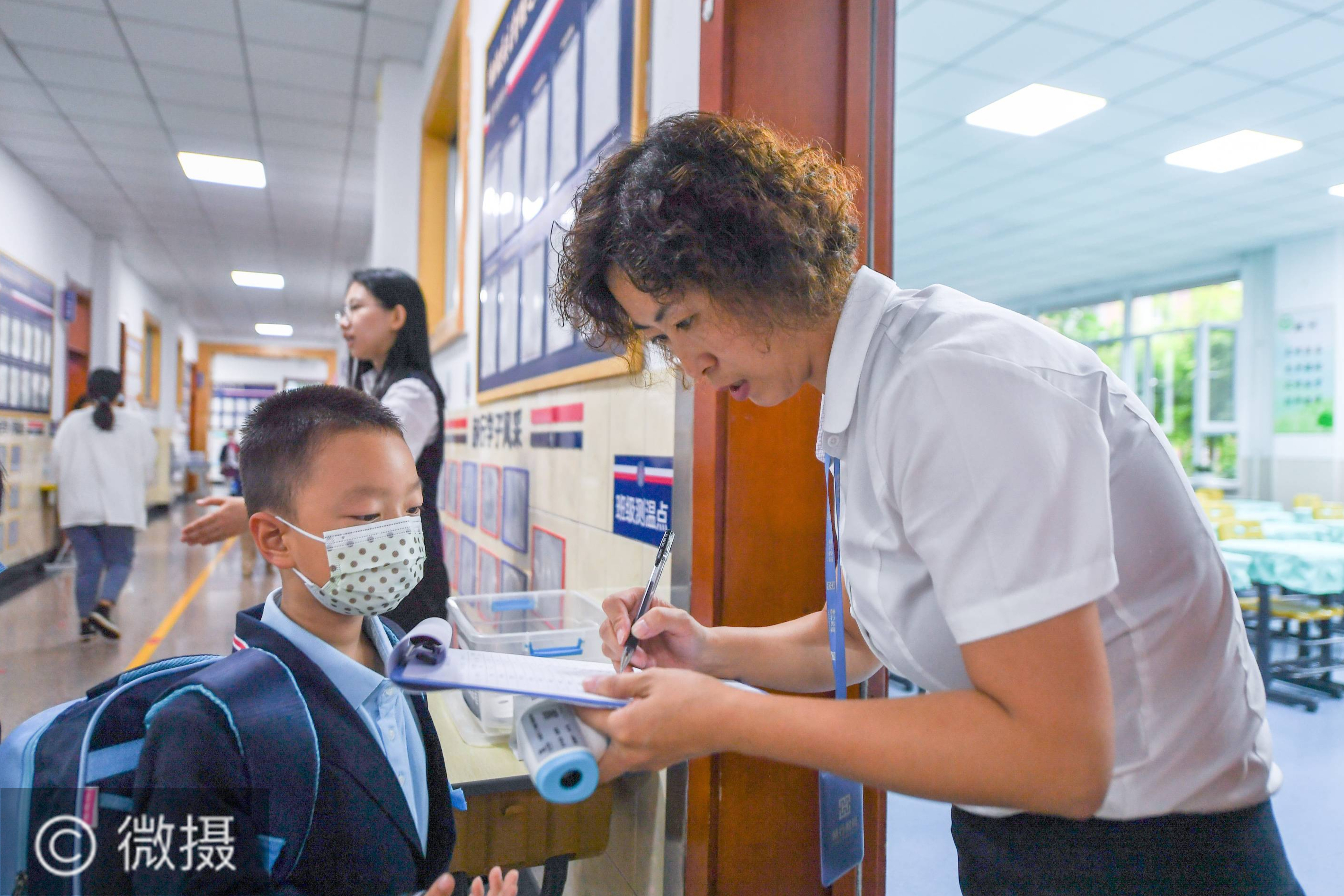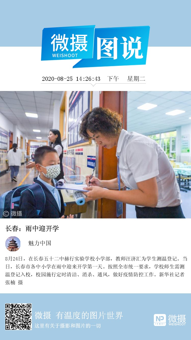 8月24日,在长春五十二中赫行实验学校小学部,教师汪济汇为学生测温登记。当日,长春市各中小学在雨中迎来开学第一天。按照全市统一要求,学校师生需测温登记入校,校园施行定时清洁、消杀、通风,做好疫情防控工作。新华社记者 张楠 摄