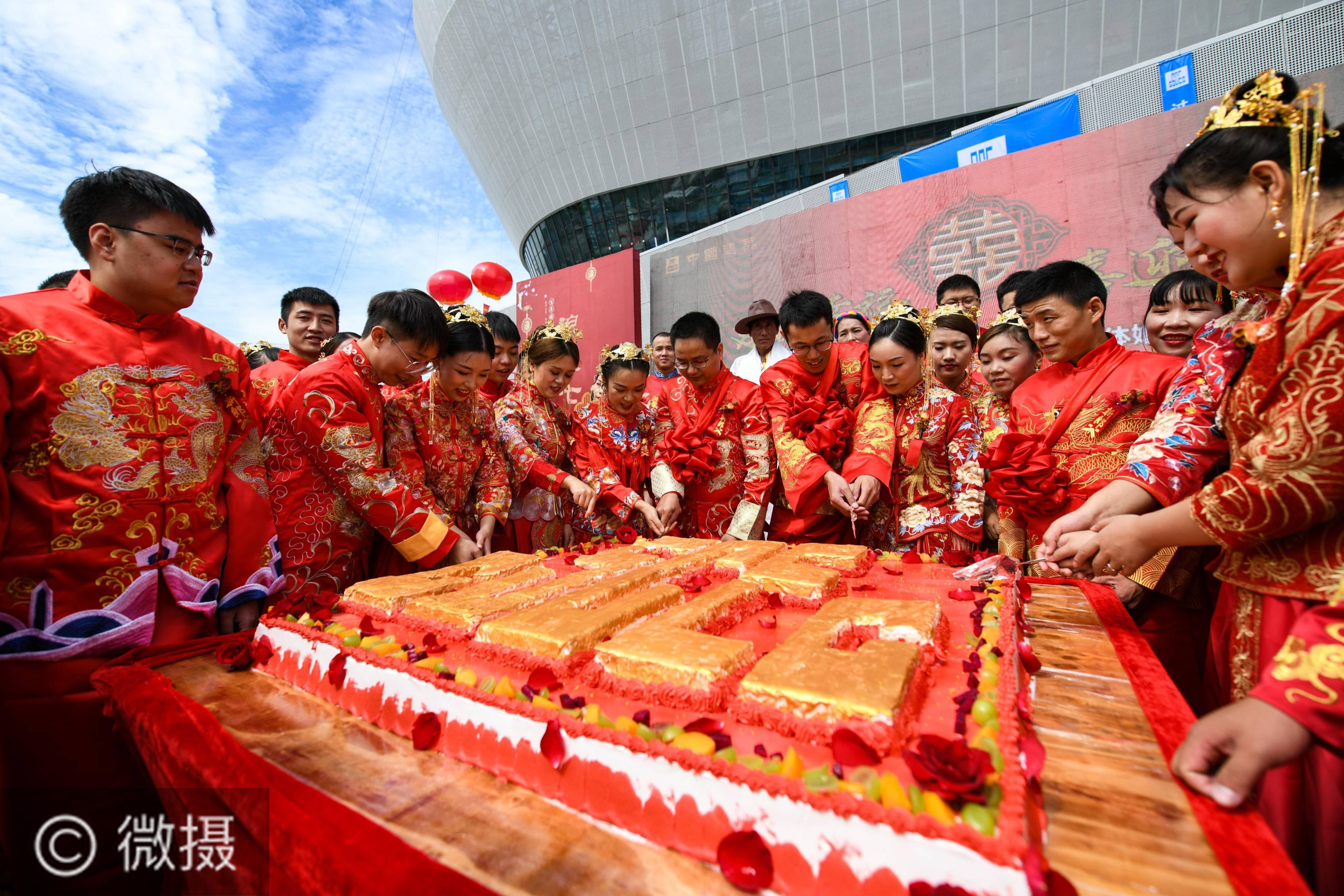 8月24日,在成都高新区体育中心项目建设现场,新人们一起切蛋糕。当日,一场以“建证幸福、喜迎大运”为主题的中式传统集体婚礼在成都高新区体育中心项目建设现场举行,22对中建四局西南分局一线建设者喜结良缘。在七夕节来临之际,中建四局西南分局特意为他们举办集体婚礼。新华社记者王曦摄