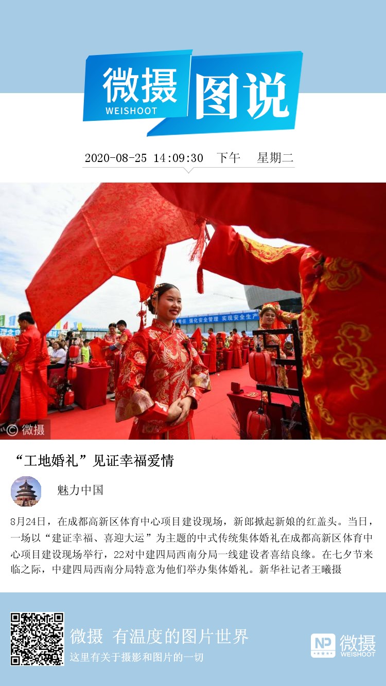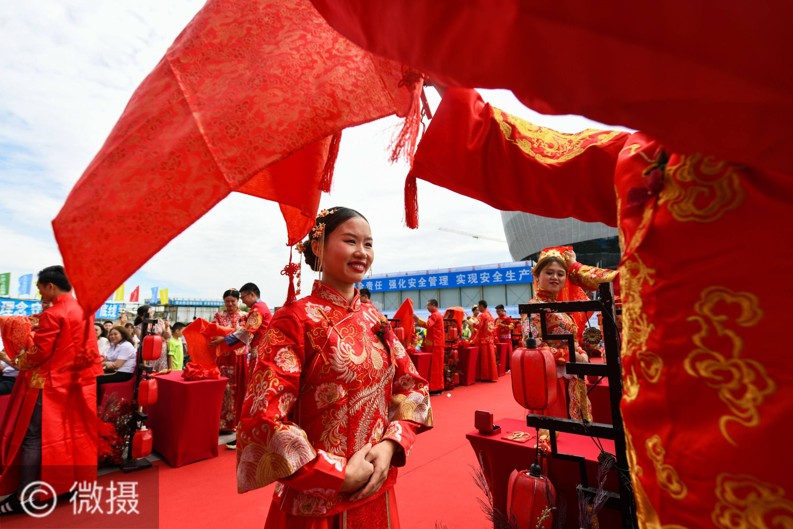 8月24日,在成都高新区体育中心项目建设现场,新郎掀起新娘的红盖头。当日,一场以“建证幸福、喜迎大运”为主题的中式传统集体婚礼在成都高新区体育中心项目建设现场举行,22对中建四局西南分局一线建设者喜结良缘。在七夕节来临之际,中建四局西南分局特意为他们举办集体婚礼。新华社记者王曦摄